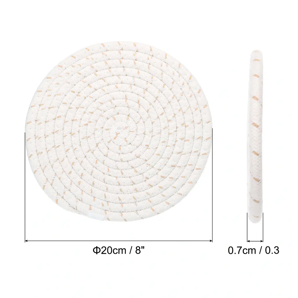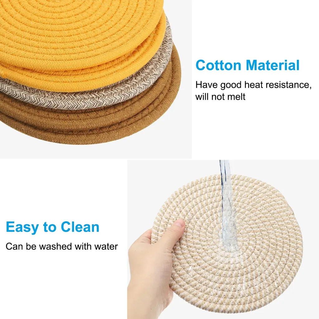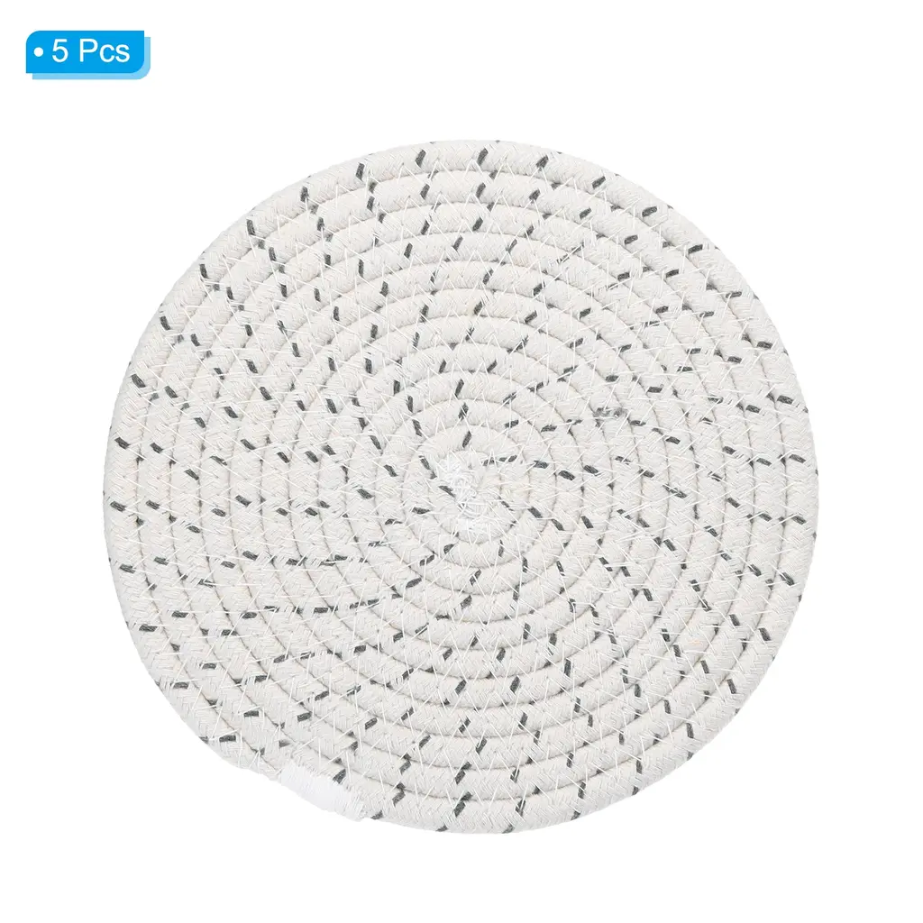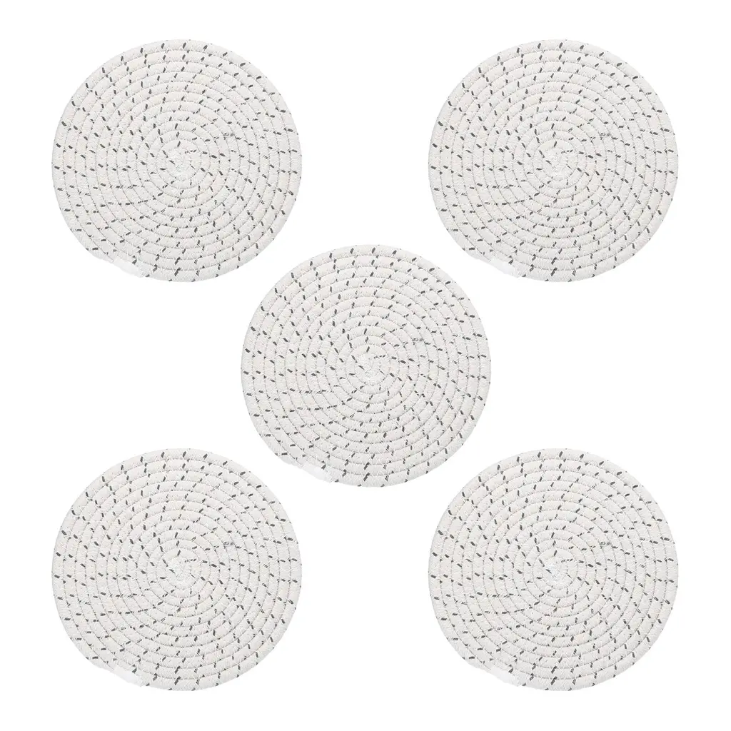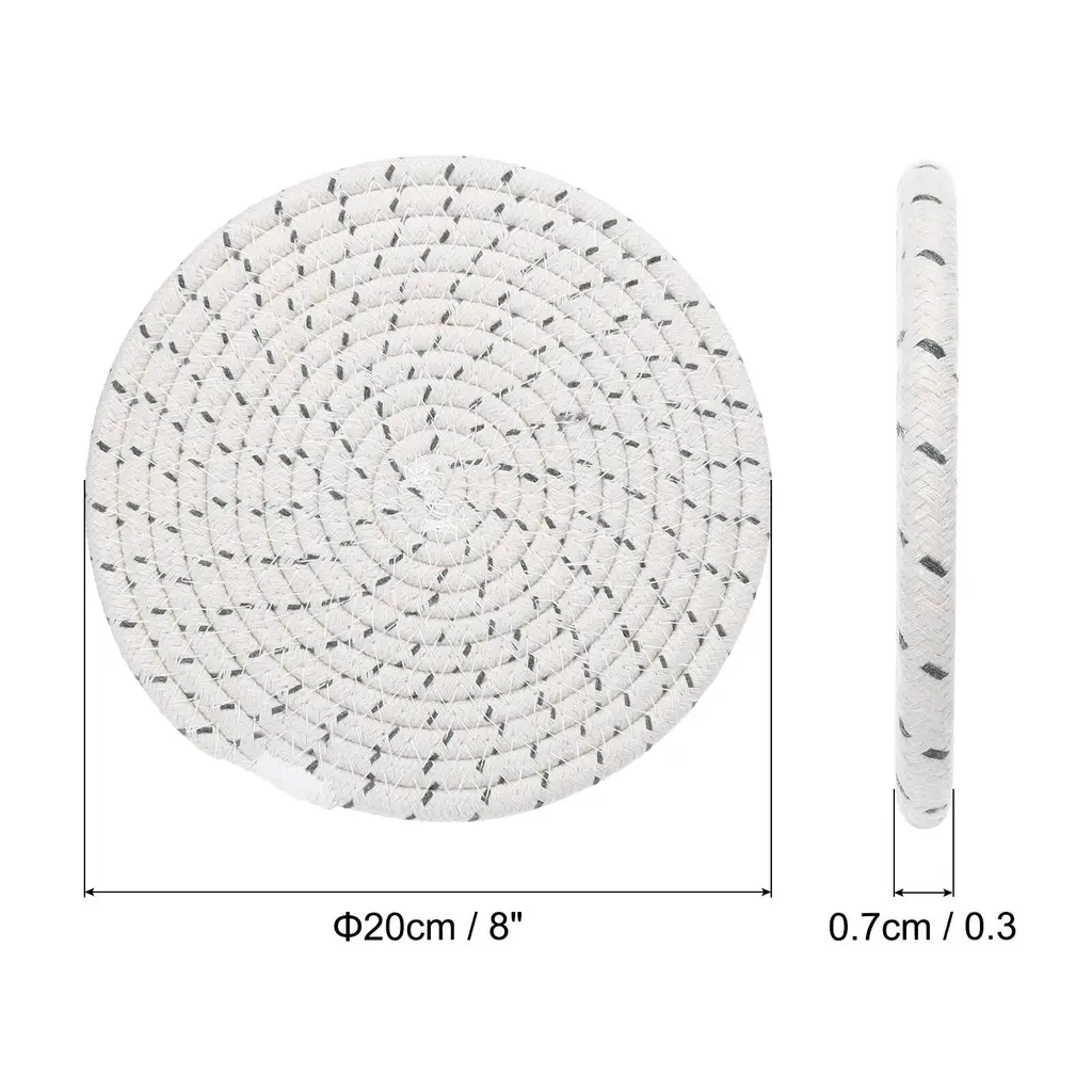 The trivet mat can be used for tabletop decoration, wall art, and as bases for displaying decorative items, adding a unique artistic atmosphere to your home in the Bohemian style. Trivets for Hot Dishes not only make your dining table, furniture and kitchen countertops clean but also can be used as coffee pot holders, hot table mats, hot pads for cooking, bowl mats, dish mats, kitchen coasters, can be a perfect mat for your candles, vases and flowerpots. Protect your counter top or table anytime.Specification Color: White GreyMaterial: CottonDiameter: 20cm / 8 inchThickness: 0.7cm / 0.3 inchPackage List: 5 x Trivets for Hot DishesAdvantagePot holders weaved with the cotton, are firm and easy to dry, have good heat resistance which will not melt, and natural cotton does not have any smell. Can washing machine for washing. Double-sided available.The trivet mats can be used for tabletop decoration, wall art, and as bases for displaying decorative items, adding a unique artistic atmosphere to your home in the Bohemian style.Instruction These woven cotton trivets can protect your desktop very well. They are suitable for Christmas parties, Thanksgiving parties, birthday parties, daily dinners, and other occasions, adding sophistication and elegance to your home.NOTE:Only need to wipe with a damp cloth to clear the surface. If there are crumbs or other powders, shake the mat gently to remove the debris.