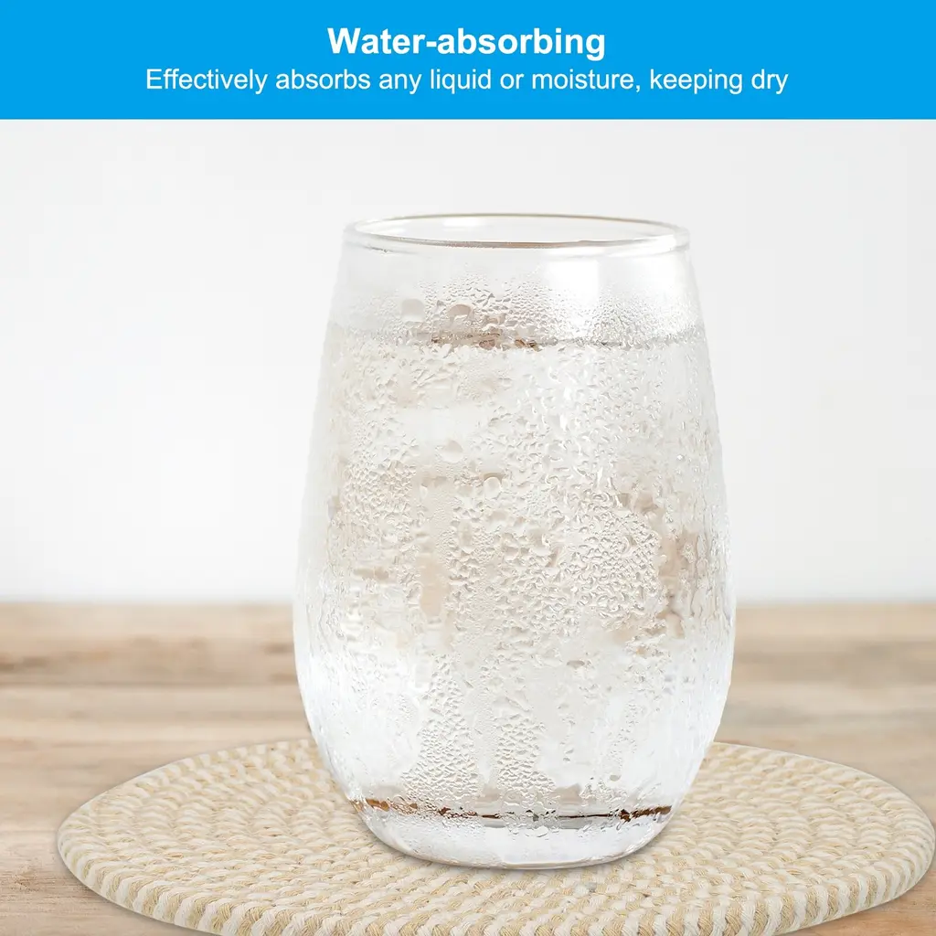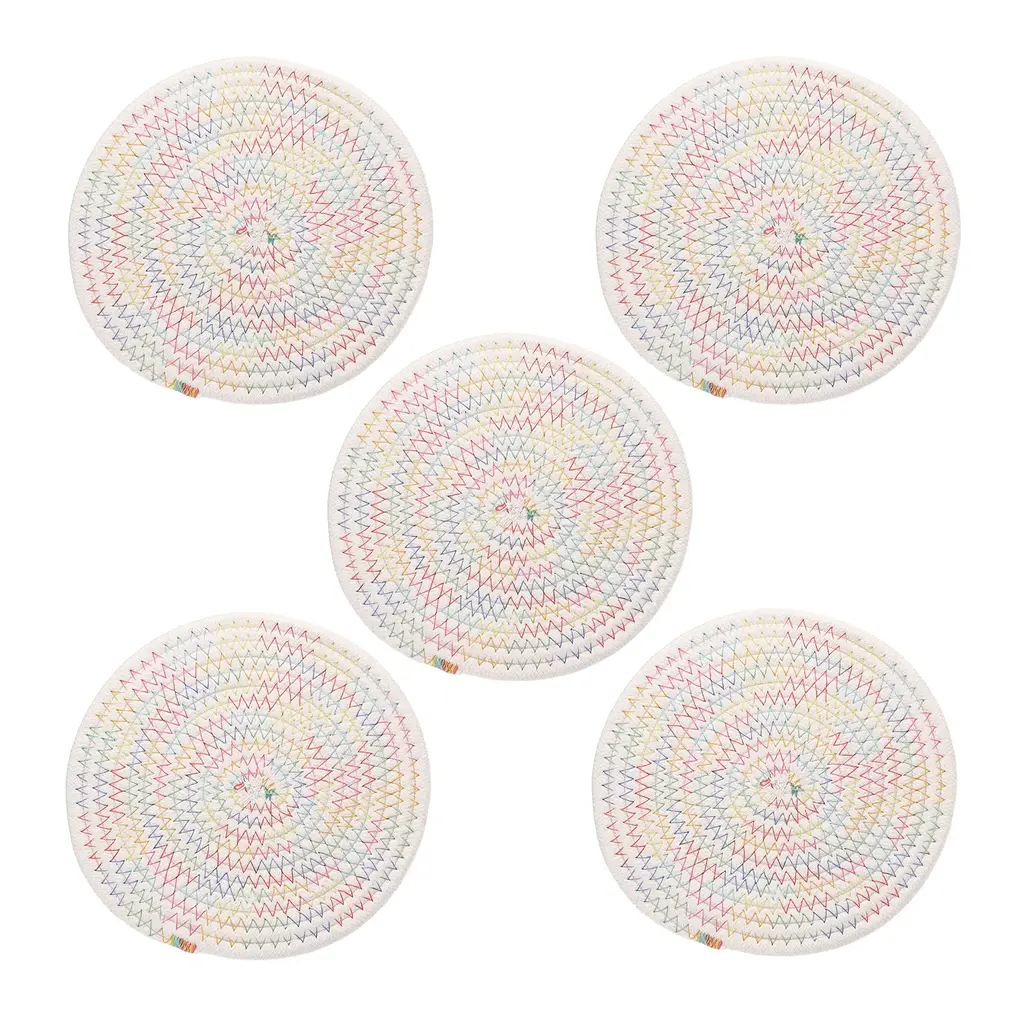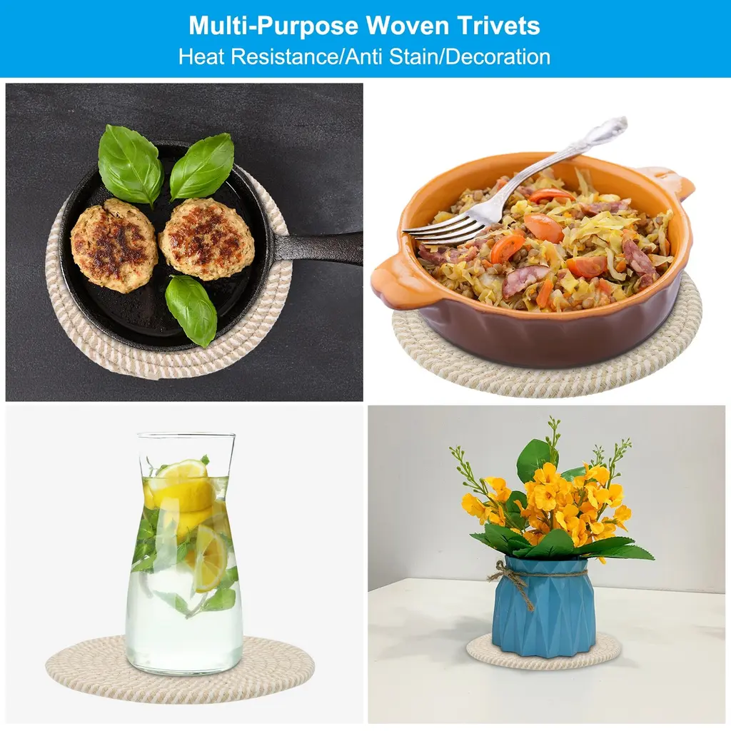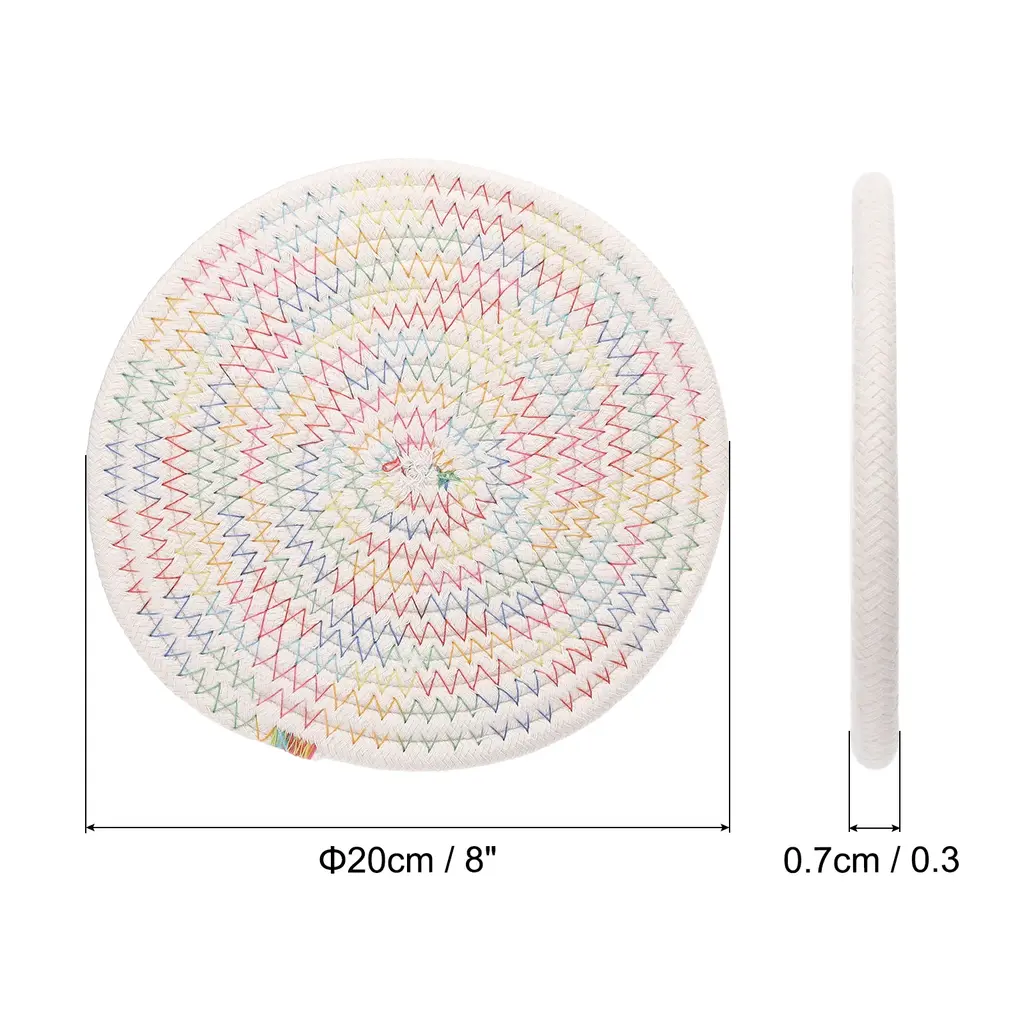 The trivet mat can be used for tabletop decoration, wall art, and as bases for displaying decorative items, adding a unique artistic atmosphere to your home in the Bohemian style. Trivets for Hot Dishes not only make your dining table, furniture and kitchen countertops clean but also can be used as coffee pot holders, hot table mats, hot pads for cooking, bowl mats, dish mats, kitchen coasters, can be a perfect mat for your candles, vases and flowerpots. Protect your counter top or table anytime.Specification Color: White with ColoredMaterial: CottonDiameter: 20cm / 8 inchThickness: 0.7cm / 0.3 inchPackage List: 5 x Trivets for Hot DishesAdvantagePot holders weaved with the cotton, are firm and easy to dry, have good heat resistance which will not melt, and natural cotton does not have any smell. Can washing machine for washing. Double-sided available.The trivet mats can be used for tabletop decoration, wall art, and as bases for displaying decorative items, adding a unique artistic atmosphere to your home in the Bohemian style.Instruction These woven cotton trivets can protect your desktop very well. They are suitable for Christmas parties, Thanksgiving parties, birthday parties, daily dinners, and other occasions, adding sophistication and elegance to your home.NOTE:Only need to wipe with a damp cloth to clear the surface. If there are crumbs or other powders, shake the mat gently to remove the debris.