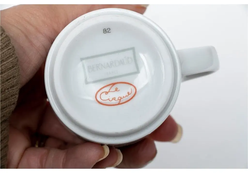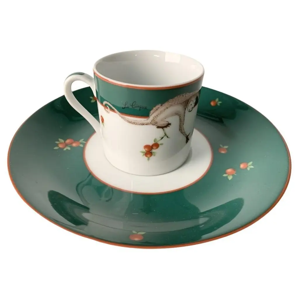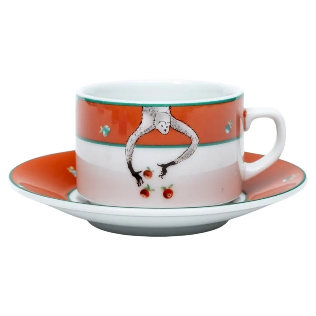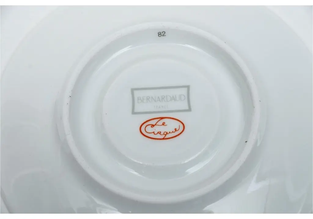 From pasta primavera to world-renowned decadent desserts, Le Cirque's ubiquitous reputation for presenting its fine dining fare with whimsy and fun, landed it on the map of must-dine destinations in New York for glitterati and foodies alike. No matter the location, monkeys and circus themes remained a design staple of the iconic restaurant. Although the landmark restaurant's NYC doors are now closed, Black Rock Galleries is pleased to offer items from the famed restaurant. Set of 6 Le Cirque Custom Bernardaud Limoges espresso cup & saucer with monkey picking fruit. Branded and made especially for Le Cirque, orange border.Dimensions: 2 1/4" W x 2 3/8" H, saucer - 5 1/2"Condition: New, never used with original box.