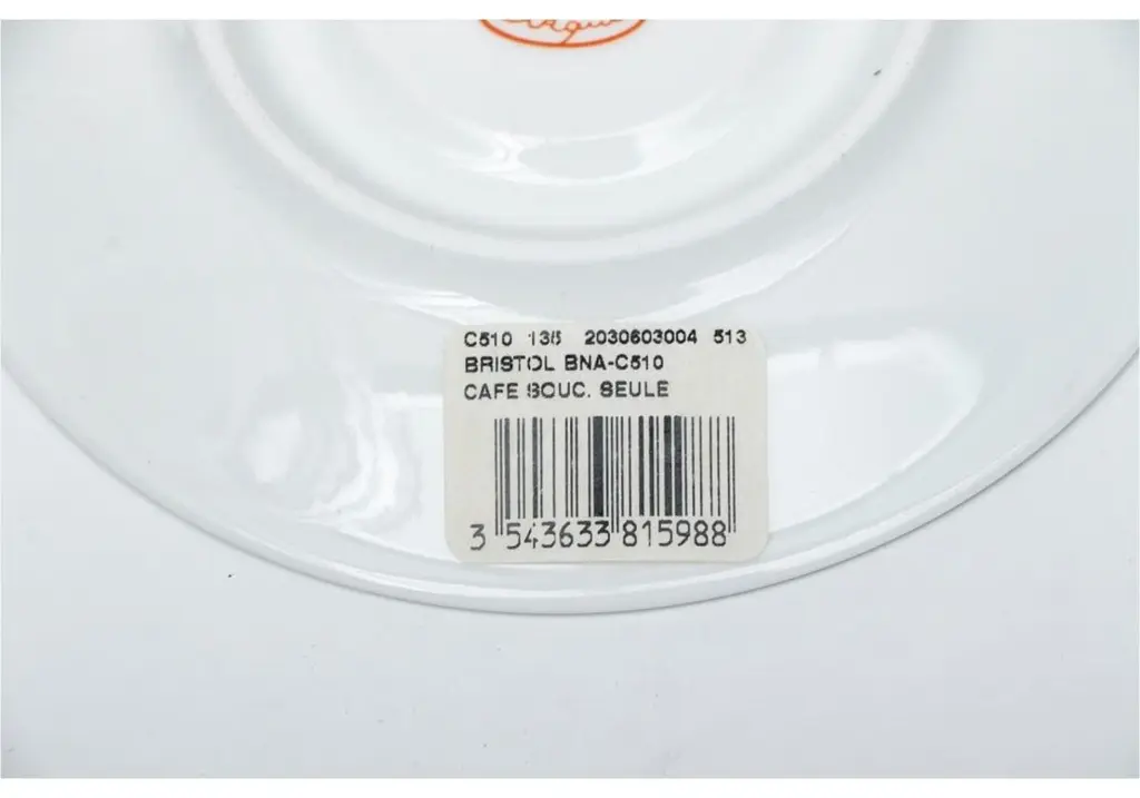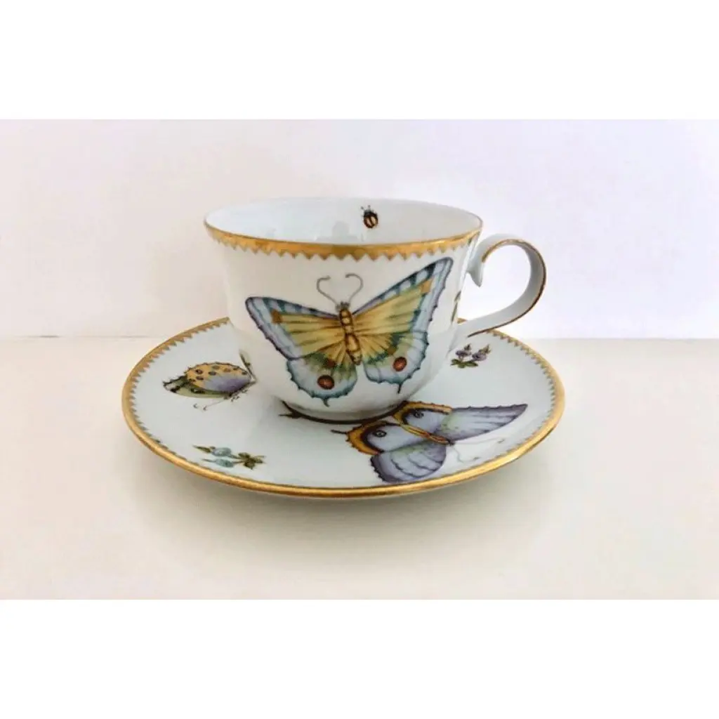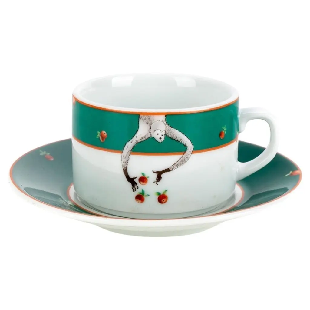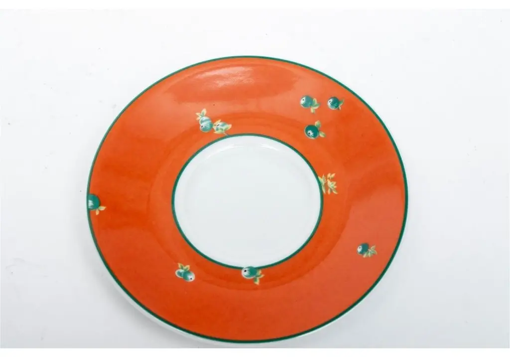 From pasta primavera to world-renowned decadent desserts, Le Cirque's ubiquitous reputation for presenting its fine dining fare with whimsy and fun, landed it on the map of must-dine destinations in New York for glitterati and foodies alike. No matter the location, monkeys and circus themes remained a design staple of the iconic restaurant. Although the landmark restaurant's NYC doors are now closed, Black Rock Galleries is pleased to offer items from the famed restaurant. Set of 6 Le Cirque Custom Bernardaud Limoges espresso cup & saucer with monkey picking fruit. Branded and made especially for Le Cirque, orange border.Dimensions: 2 1/4" W x 2 3/8" H, saucer - 5 1/2"Condition: New, never used with original box.