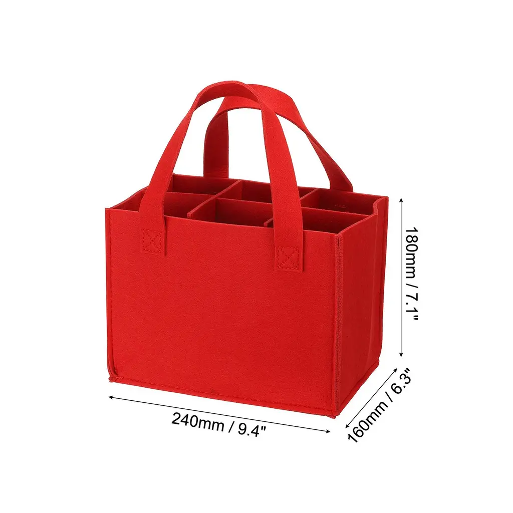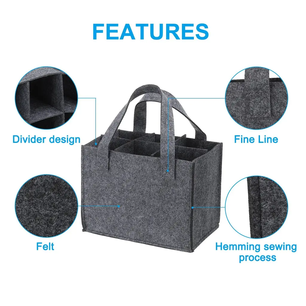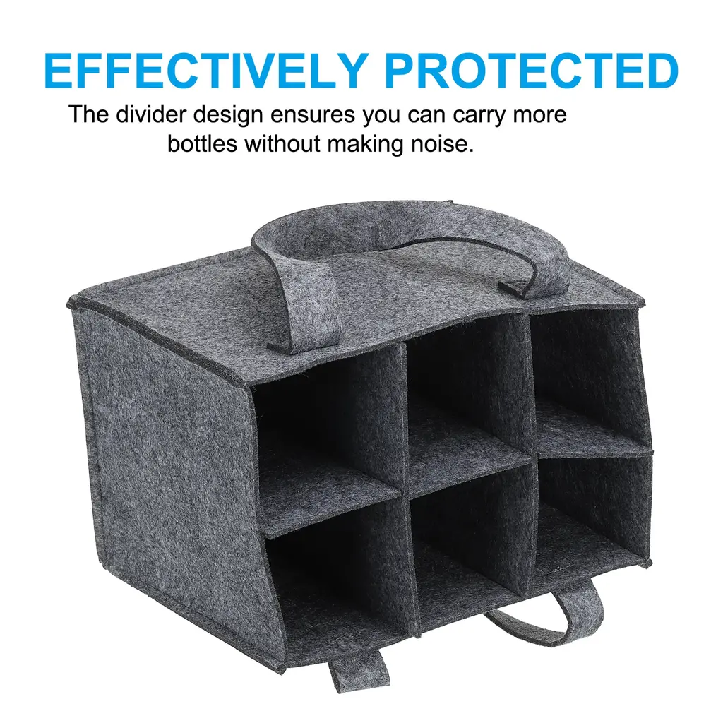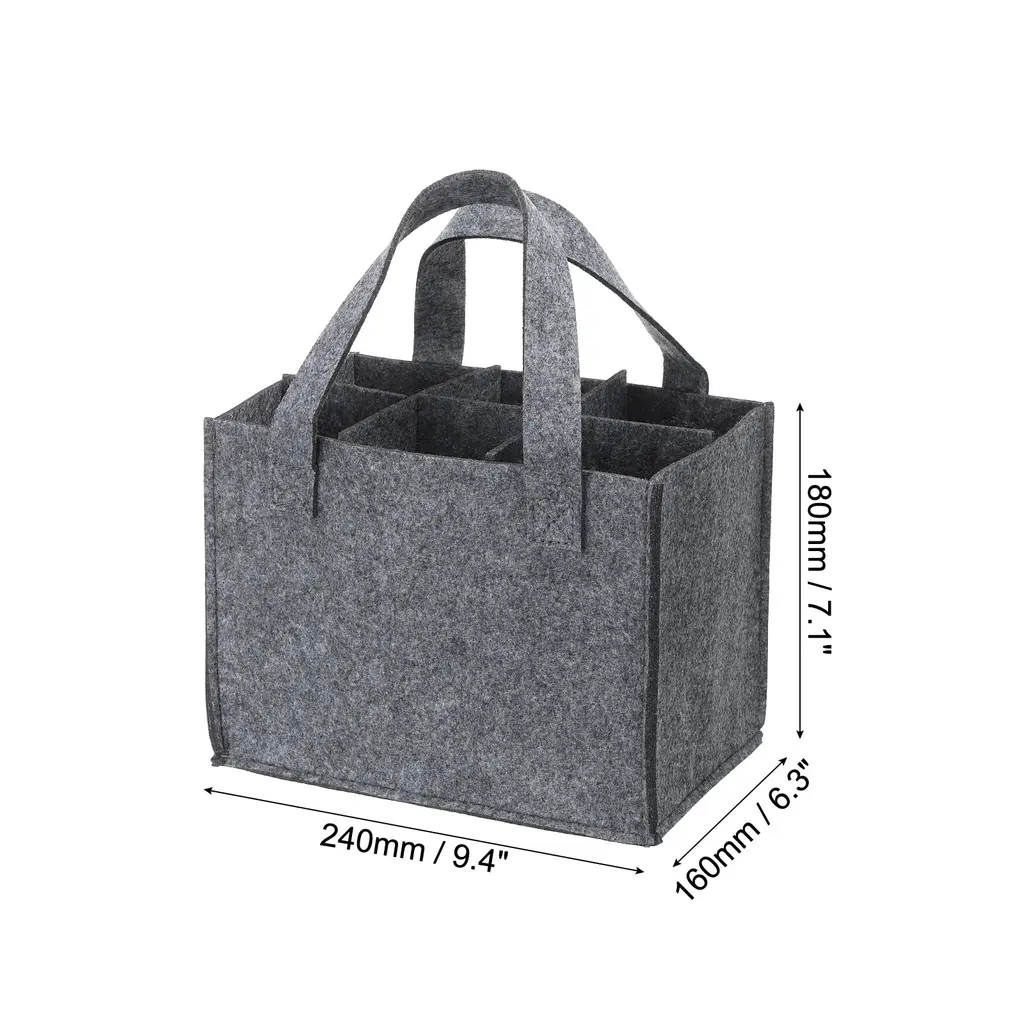 It is used to store the wine bottle and provides a secure and protective solution for transporting. Suitable for wine enthusiasts, travelers, or anyone in need of a reliable and stylish storage container. It is also a gift for family and friends at outdoor picnics, parties, weddings, birthdays, holidays, anniversary, or any special occasion.SpecificationColor: GreyMaterial: FeltSize: 240 x 180 x 160mm / 9.4 x 7.1 x 6.3 inch(L*W*H)Packing List: 1 x Wine Carrier ToteAdvantageThe thick and durable neoprene material acts as a cushion, preventing breakage. With a spacious interior that can accommodate standard-sized wine bottles. Its lightweight and compact design makes it easy to carry. The edge has a hemming sewing process, which is strong and durable. It is foldable when not in use to save space.InstructionPut the wine bottle vertically into the wine storage bag and pick it up with the handle. The divider design ensures you can carry more bottles without making noise. The soft and comfortable handles provide a secure and portable grip.NOTE: As well as holding a wine bottle, it can also store books, craft and knitting supplies, or other tools.