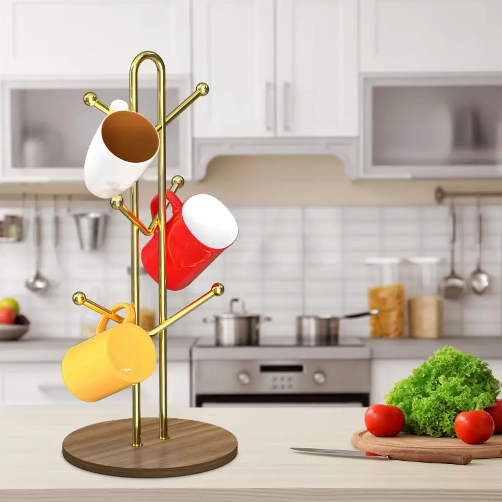6-hook Mug Tree – Metal, Floral Base, Gold