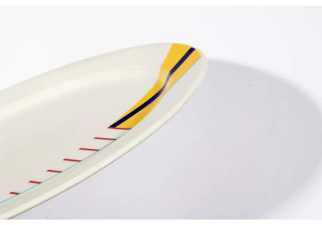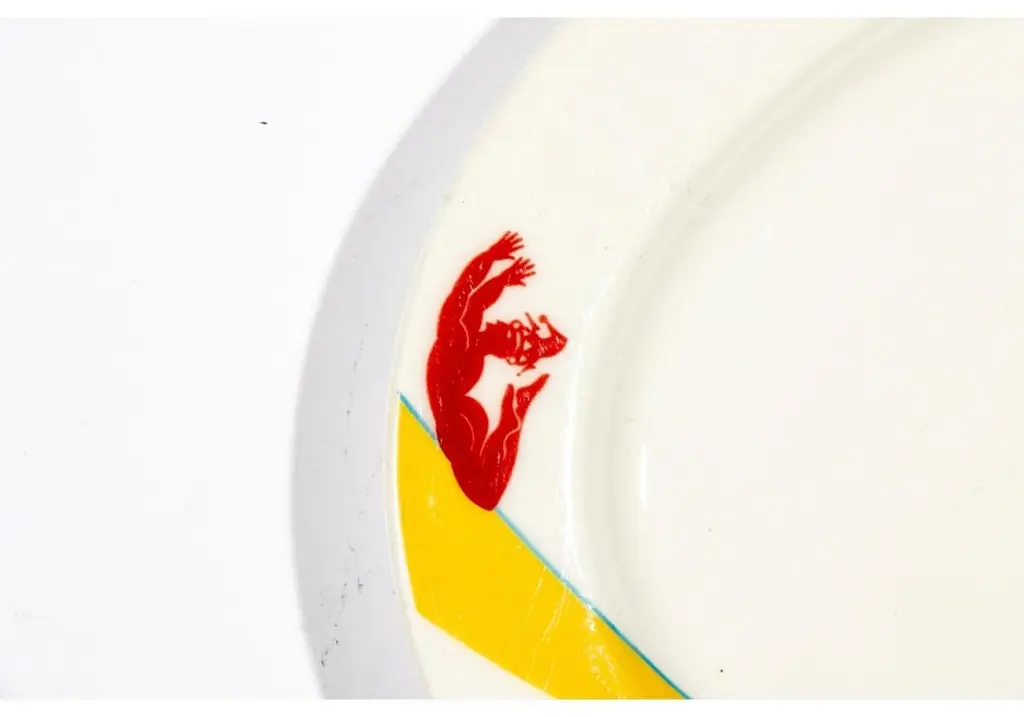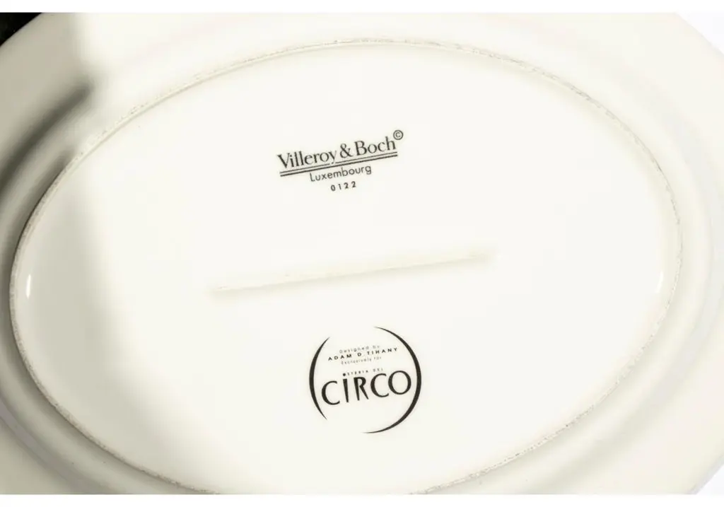 From pasta primavera to world-renowned decadent desserts, Le Cirque's ubiquitous reputation for presenting its fine dining fare with whimsy and fun, landed it on the map of must-dine destinations in New York for glitterati and foodies alike. No matter the location, monkeys and circus themes remained a design staple of the iconic restaurant. Although the landmark restaurant's NYC doors are now closed.Villeroy & Boch custom porcelain oval plates for Osterio del Circo (Le Cirque) restaurants. Designed by Adam D. Tihany. The plates with red trapeze artist, tightrope and ladder. Marked on verso designed by Adam D. Tihany exclusively for Osteria del Circo. Plates were used in Le Cirque New York after 1995.Measurements: 11" x 8 1/2" x 3/4"Condition: Service and glaze wear consistent with repeated restaurant use, no chips or cracks.