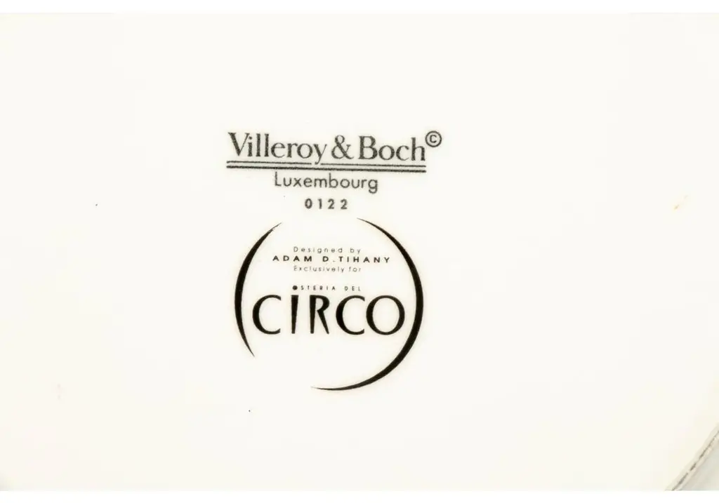 From pasta primavera to world-renowned decadent desserts, Le Cirque's ubiquitous reputation for presenting its fine dining fare with whimsy and fun, landed it on the map of must-dine destinations in New York for glitterati and foodies alike. No matter the location, monkeys and circus themes remained a design staple of the iconic restaurant. Although the landmark restaurant's NYC doors are now closed, We are pleased to offer items from the famed restaurant.Villeroy & Boch custom porcelain dinner plates for Osterio del Circo (LE CIRQUE) designed by Adam D. Tihany.The plates with a red trapeze artist on a high wire with ladder. Custom made by Villeroy & Boch in Luxembourg and marked on the back. These were used multiple times at the Le Cirque N.Y. location after 1995.Dimensions: 10 1/2" x 7/8"Condition: Glaze and service wear consistent with repeated restaurant use.
