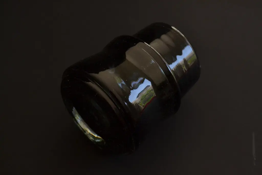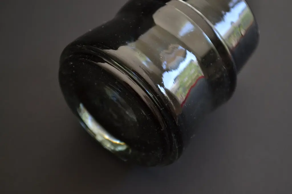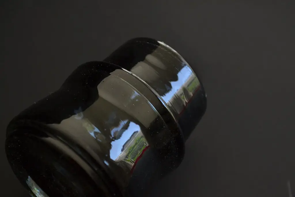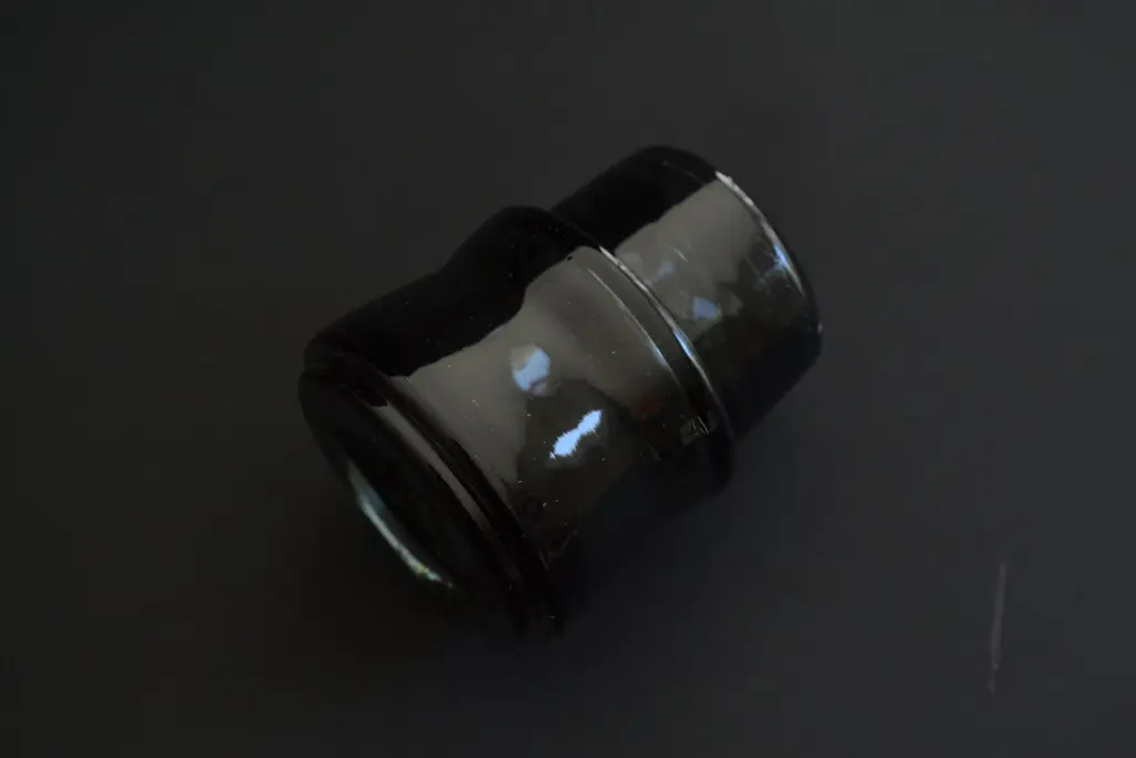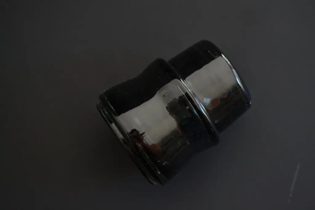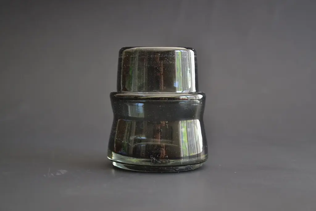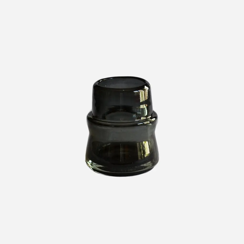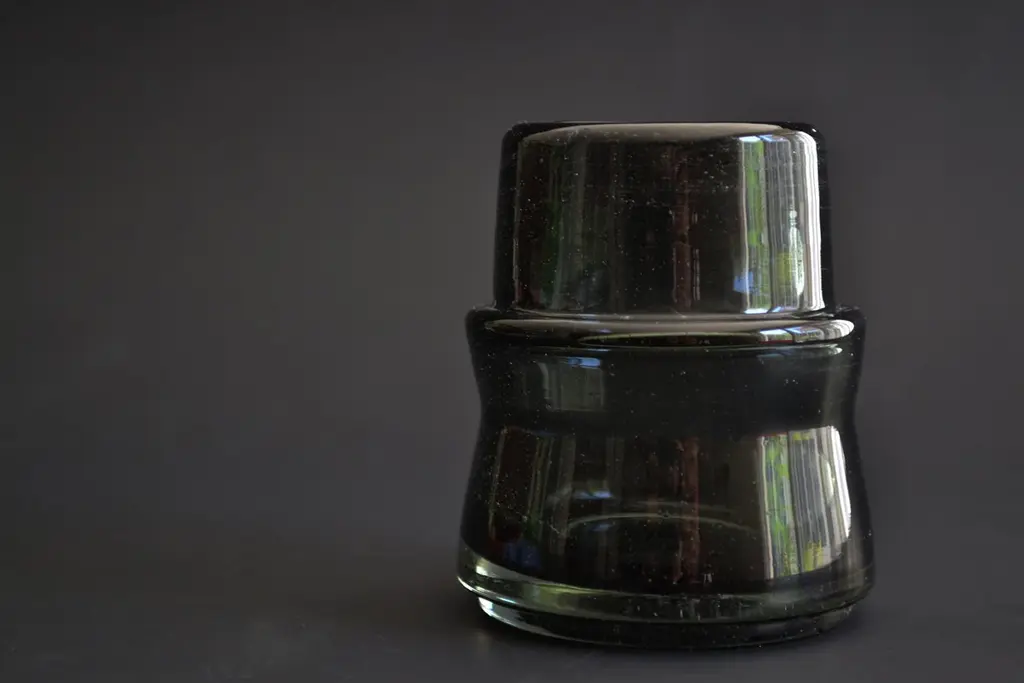 The shape of this collection of glasses is manifested from the union of two elements.A cylindrical center and a kind of wavy ring that forms an X that in turn refers to the way the ancient Mexicas tied their flowers or canes.There is even a symbol for this "ACATL" or reedThis form has also been used in architecture, the anahuacalli museum for example, if the central part of the building is observed on the facade, it makes this movement in the shape of an X that the reeds produce when tied to the center with force and this form gives stability to the tie to stay in vertical formHandblown heavy dark black glasses, perfect for Mezcal, Tequila, Schnapps or any other liqueurFrom the traditional workshops in Tonalá, Jalisco, we present this collection of handblown glasses made in 100% recycled glass. The glasses can present some size variations and bubbles from the process of production, we love these details that give individuality and texture to the pieces.SizeDiameter 6cm. Height 6cm.Capacity 100ml.