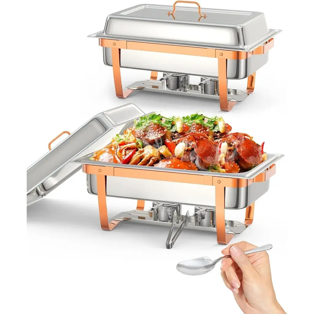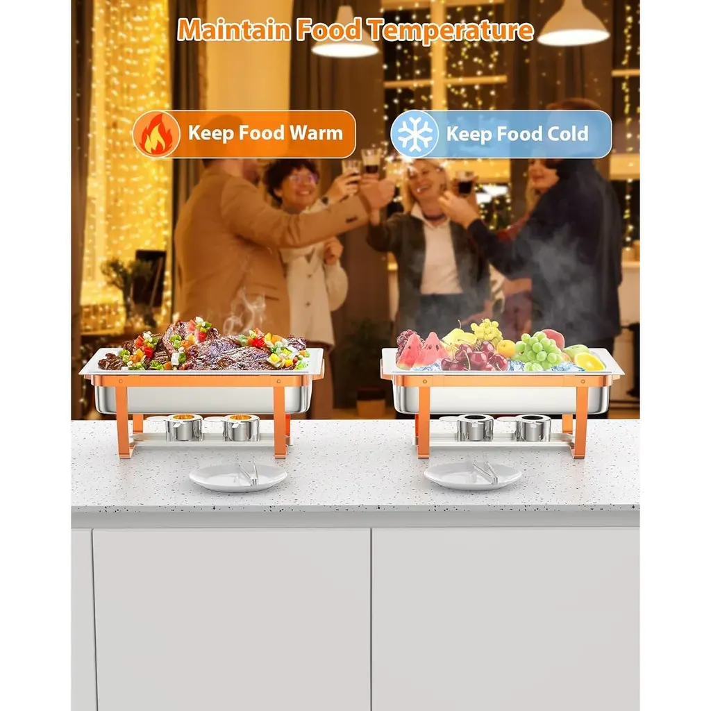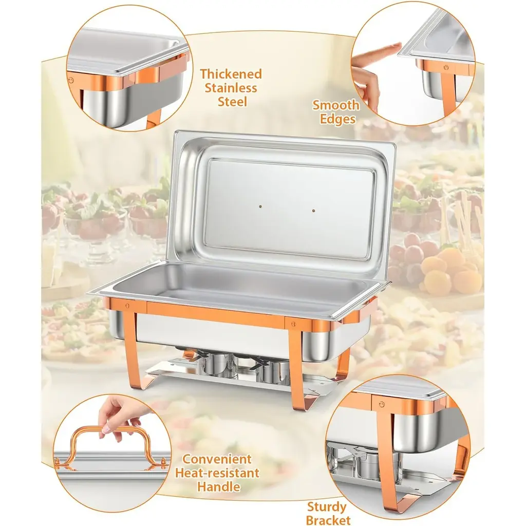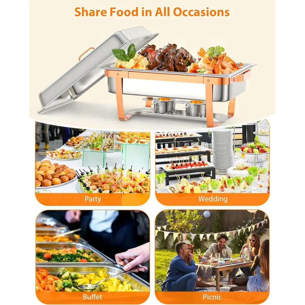 【Food-Grade Stainless Steel】- Made of upgraded SS201, our chafing dish set is built to withstand everyday use, while providing a timeless appearance that blends in with your classic decor. It also features easy maintenance and cleaning. The polished cover is not easy to deform and break.【Easy to Install and Store】- The chafing dish buffet set with ease of use in mind. With minimal screws, it is a breeze to install. You only need to screw the bracket and lid, and it's done in 5 minutes!【Keep Food Warm or Cool】- The chafing dish buffet set for catering is designed to effectively keep food warm or cool, ensuring the optimal temperature for various dishes. When needs to warm food, add hot water and the fuel can, and when food needs to be cooled, add ice cubes, which allows for maintaining the desired temperature of the food throughout the event, delivering a delightful dining experience for guests【Widely Used】】- Our Buffet set has everything you need to satisfy no matter a family party or commercial use such as reception, event catering, banquet, wedding, etc.The stackable design ensures space-saving, easy transportation, and storage.【Package Component Included】- 6 x Rectangle Lids; 6 x Food Pans; 6 x Water Pans; 6 x Chafing Dish Frames; 12 x Fuel Cans; 3 x Spoon; 3 x Tweezer