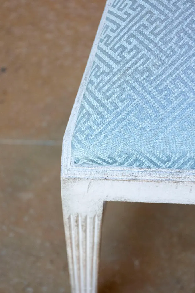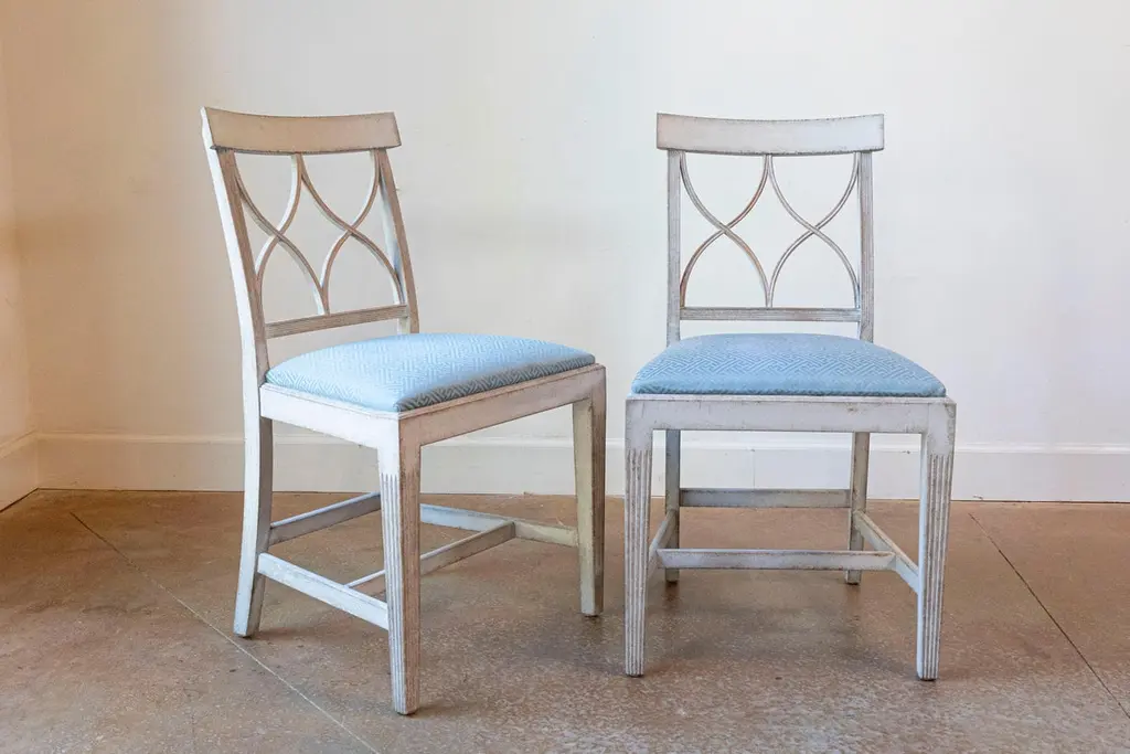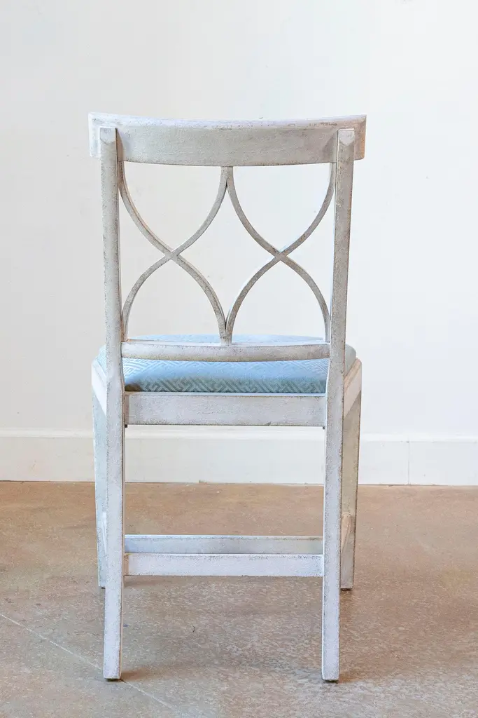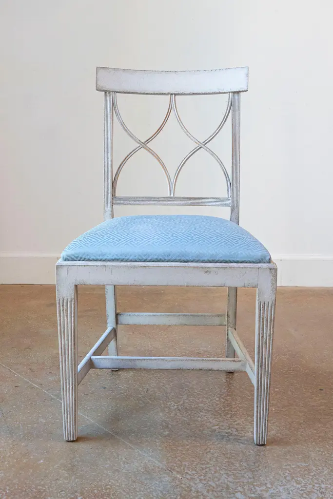 Priced Each - 6 Swedish dining room side chairs from the early 20th century, with new upholstery. Created in Sweden during the early years of the 20th century, each of this set of side chairs features an open back pierced with sinuous motifs and topped a curving upper rail, flowing seamlessly into the hind legs. A rectangular seat, covered with an existing blue fabric with meander motifs, rests upon four legs, tapered and fluted in the front, and connected to one another through an H-Form cross stretcher. Painted in a soft color typical of the Scandinavian taste and boasting a nicely aged patina, the 6 Swedish chairs circa 1900 will bring a touch of simple elegance to any dining room! $1700 for each chair.