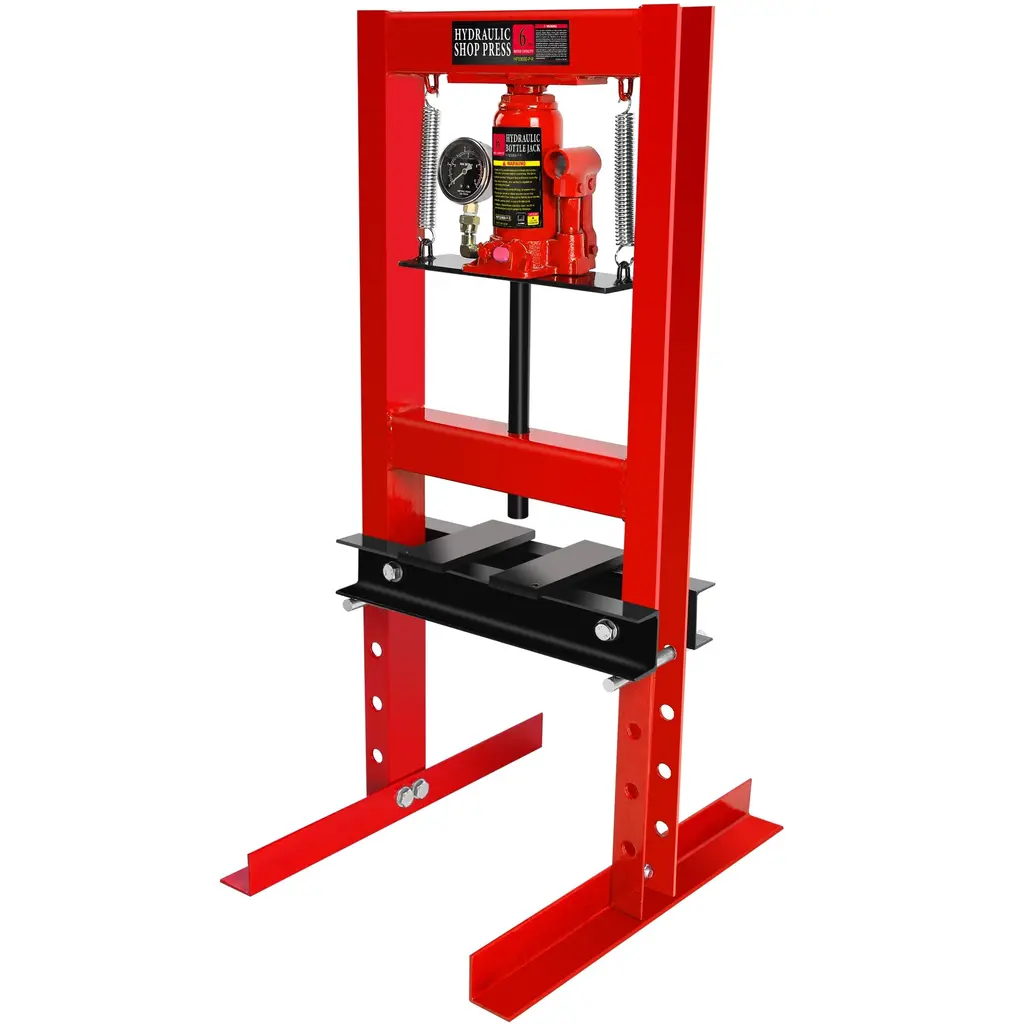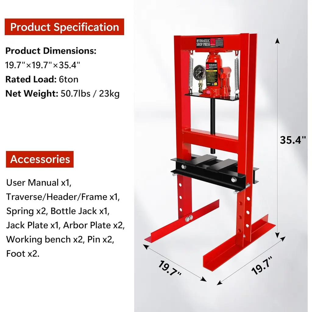 6-ton Capacity: Equipped with a bottle jack that has a 6-ton capacity, this shop press simplifies the processes of straightening and bending metal. It is perfect for various metalworking tasks, including bending, straightening, and stamping, providing reliable support for a range of operations.Multifunctional Use: The shop press features a built-in pressure gauge, allowing you to monitor pressure changes at all times. With an adjustable height range from 2.2" to 9.4", this hydraulic shop press is ideal for bending or straightening metal. The convenient pin system makes height adjustments effortless, and the two movable stamping plates are perfect for securely holding small parts during operations.H-shaped Frame Robust And Stable Design: The H-shaped frame structure guarantees a solid base, preventing any wobbling or shaking while in use. Constructed from high-strength carbon steel, this hydraulic press delivers durability and stability for consistent performance.High-quality Precision Springs: The precision springs are designed to return slowly and safely after each pressing action, while the treated and polished piston-ram is resistant to skiving. Operating the hydraulic press is straightforward, requiring only the pressing or lifting of the long handle attached to the bottle jack.Safe And User-friendly Features: An automatic relief valve activates when the pressure exceeds 6 tons, protecting the workbench from overpressure damage. Additionally, there are four holes on each side to adjust the working table's height, allowing users to customize the working height to meet their specific requirements.Product DescriptionName: 6-ton Powerful Hydraulicshop PressColor: Black/Red/BlueProduct Dimensions:19.7"x19.7"x35.4"Rated Load: 6ton(With Pressure Gauge)Net Weight: 50.7lbs/23kgAccessories: User Manual x1,Traverse/Header/Frame x1,Spring x2, Bottle Jack x1,Jack Plate x1, Arbor Plate x2, Working bench x2, Pin x2, Foot x2.