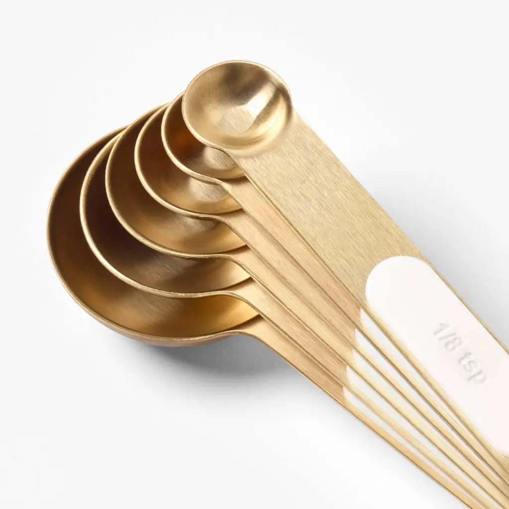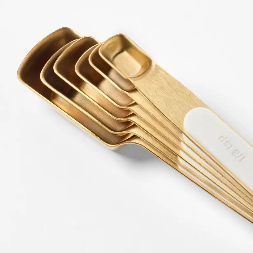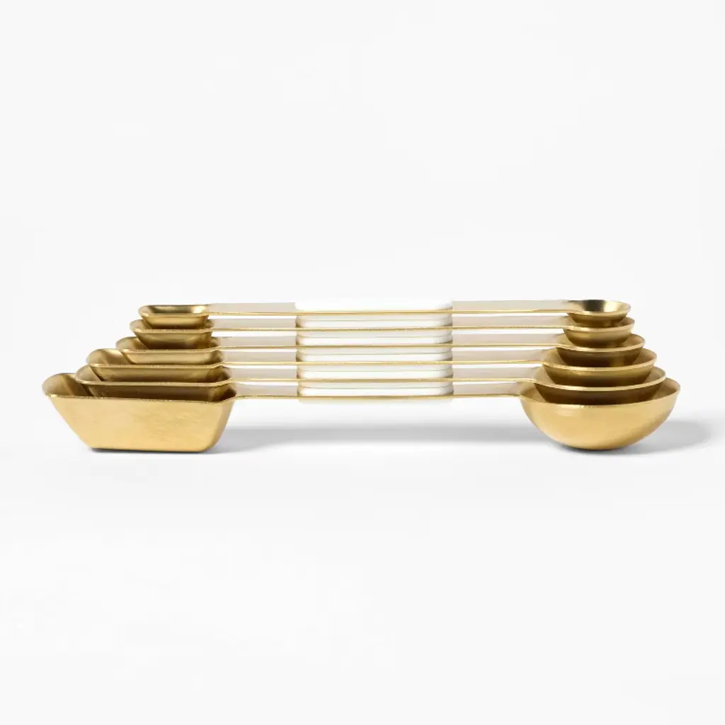This 6-PIece Magnetic Measuring Spoon Set from Figmint™ helps you precisely measure ingredients when cooking or baking. This set includes six spoons with volumes of 1/8 teaspoon, 1/4 teaspoon, 1/2 teaspoon, one teaspoon, 1/2 tablespoon and one tablespoon. Made from metal with a gold finish, these teaspoons feature a magnetic design for easy, space-saving storage and can be tossed in the dishwasher to clean.Figmint™: Mixing up a taste of adventure every day.