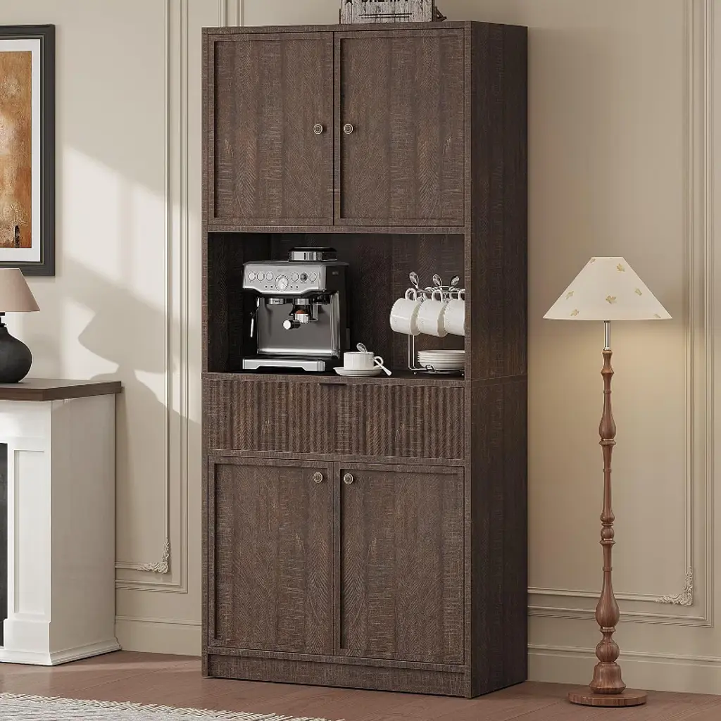 This tall cabinet combines practicality with smart design: 2 shelved cabinets, 1 deep drawer on smooth metal slides, and a spacious open compartment.Beyond the kitchen, repurpose it as a hallway console for photos/mementos, a living room organizer, or a chic coffee bar—versatility that grows with your lifestyle.