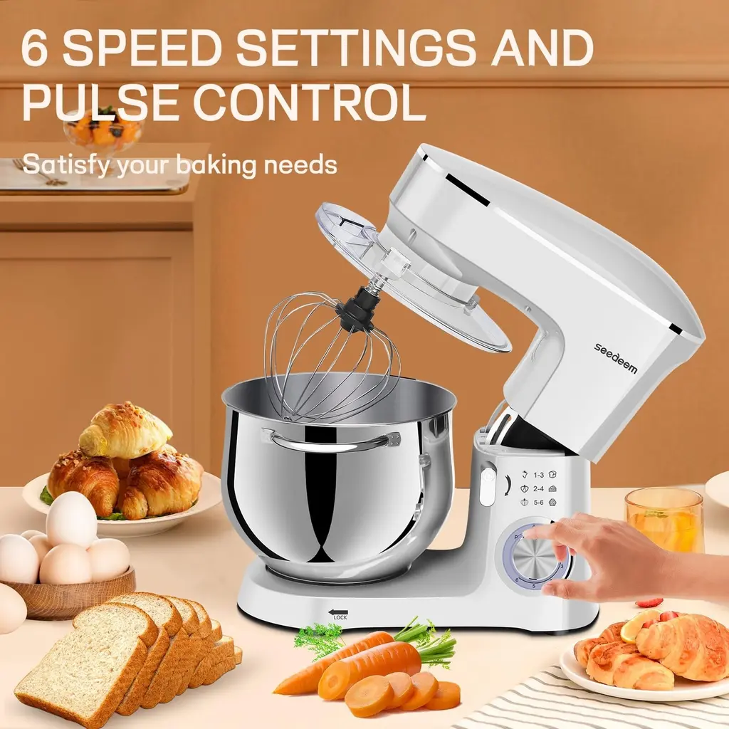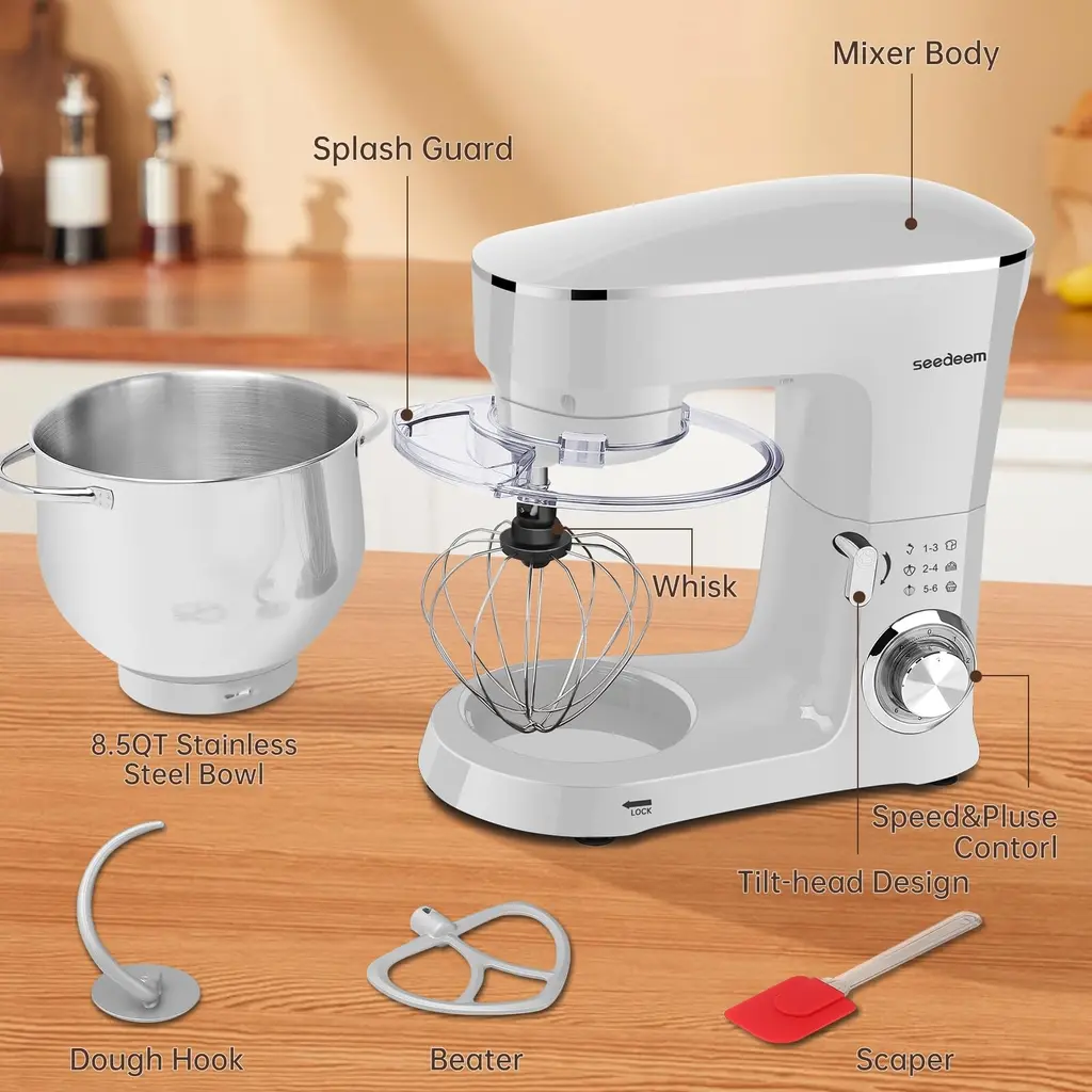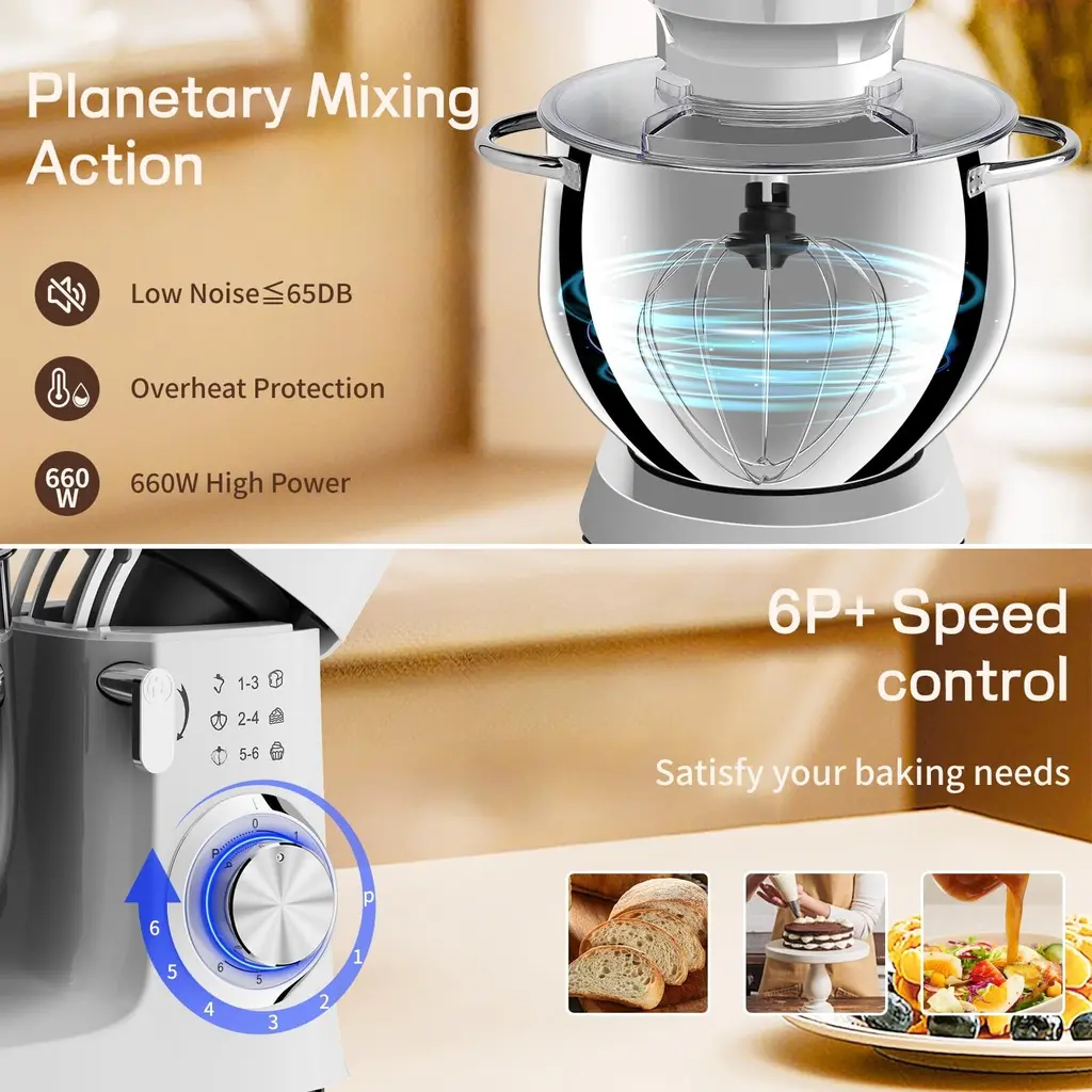 1.660 watt motor and 6 speed settings option: This blender is equipped with a 660 watt high performance motor for quiet operation. It also has 6 speed settings for you to choose from, the precise 6+P speed control allows you to choose from slow to fast mixing. Its pulse function makes it easier to control the whipping level of the cream during processing, making it softer and smoother.2.Large capacity 8.5QT: The 8.5QT large capacity mixing bowl is made of food grade 304 stainless steel, which completely ensures food safety. The large capacity can meet the daily use of multi-person family, easy to make biscuits, bread, cakes and other delicious food. The stainless steel bowl and handle are dishwasher safe. Perfect for large families or people who like to bake in bulk.3.Quality accessories: the mixer is equipped with a dough hook, beater, whisk and splash guard, different tools are available for different ingredients, the splash guard avoids splashes when mixing and adding ingredients, convenient for you to add the necessary ingredients at any time.4.Reliable overall design: full metal gear + ball bearing + belt structure, output shaft with leakproof structure, planetary rotation, full mixing. Silicone suction cups keep the mixer stable during use, so you don't have to worry about any movement or shaking during cooking.5.After sales service: If you receive defective goods or have any problems during use, you can contact us at any time. We provide 24-hour online service.