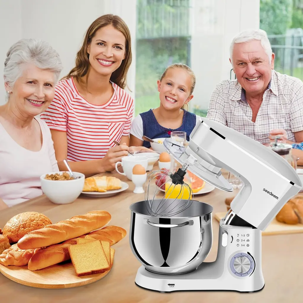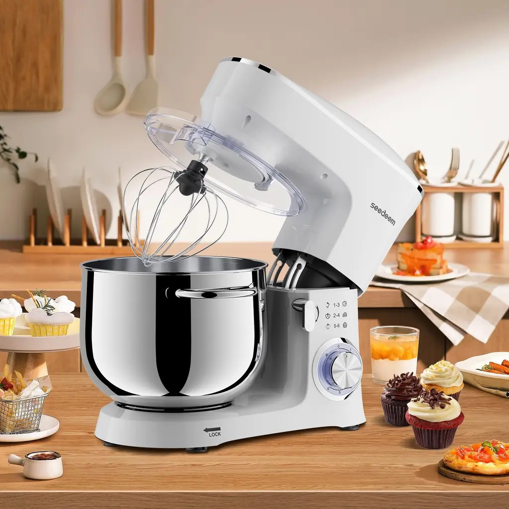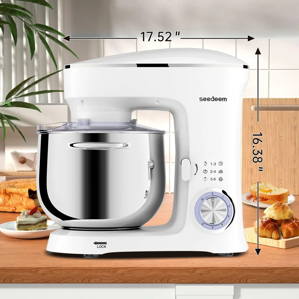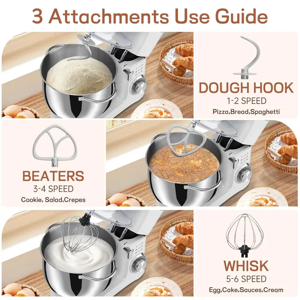 1.660 watt motor and 6 speed settings option: This blender is equipped with a 660 watt high performance motor for quiet operation. It also has 6 speed settings for you to choose from, the precise 6+P speed control allows you to choose from slow to fast mixing. Its pulse function makes it easier to control the whipping level of the cream during processing, making it softer and smoother.2.Large capacity 8.5QT: The 8.5QT large capacity mixing bowl is made of food grade 304 stainless steel, which completely ensures food safety. The large capacity can meet the daily use of multi-person family, easy to make biscuits, bread, cakes and other delicious food. The stainless steel bowl and handle are dishwasher safe. Perfect for large families or people who like to bake in bulk.3.Quality accessories: the mixer is equipped with a dough hook, beater, whisk and splash guard, different tools are available for different ingredients, the splash guard avoids splashes when mixing and adding ingredients, convenient for you to add the necessary ingredients at any time.4.Reliable overall design: full metal gear + ball bearing + belt structure, output shaft with leakproof structure, planetary rotation, full mixing. Silicone suction cups keep the mixer stable during use, so you don't have to worry about any movement or shaking during cooking.5.After sales service: If you receive defective goods or have any problems during use, you can contact us at any time. We provide 24-hour online service.