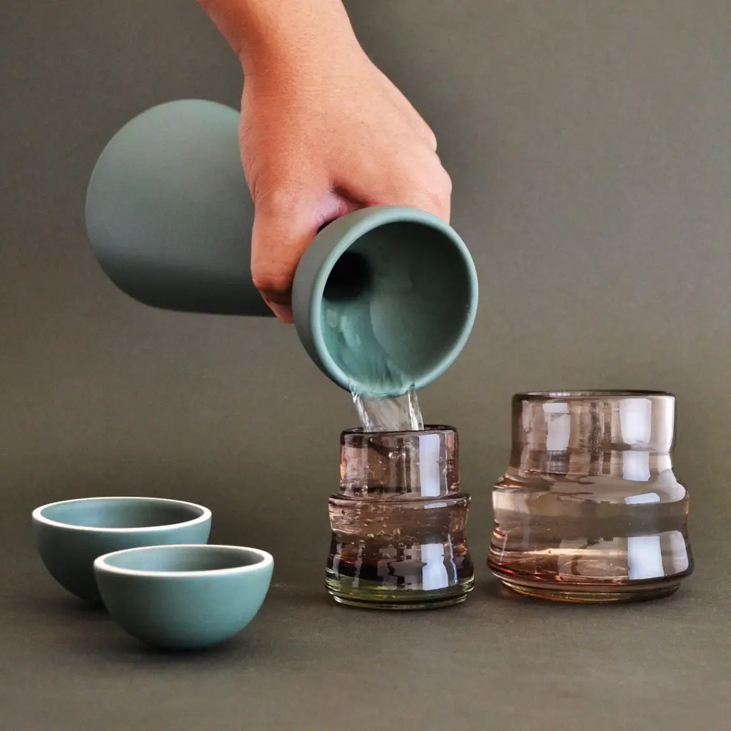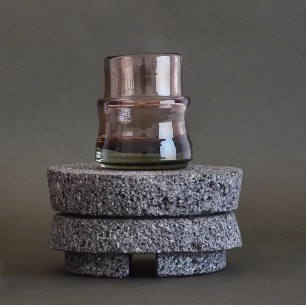 Acatl is a collection of Tumblers and liquor, Mezcal and Tequila glasses in 6 different colours. Produced in an artesanal way in Jalisco, Mexico using 100% recycled glass. The shape of this collection of glasses is manifested from the union of two elements. A cylindrical center and a ring that forms an X shape that in turn refers to the way the ancient Mexicas tied their flowers or canes, the symbol for this "ACATL" or reed. The Acatl symbol shape was used in several sculptures of the pre conquist times and in several cultures around what is today Mexico. This form has also been used in architecture, the anahuacalli museum for example, if the central part of the building is observed on the facade, it makes this movement in the shape of an X that the reeds produce when tied to the center with force and this form gives stability to the tie to stay in vertical way.These glasses are made of 100% recycled glass, mainly coca cola bottles, curiously Mexico is among the countries with the highest consumption of this soft drink in the world.