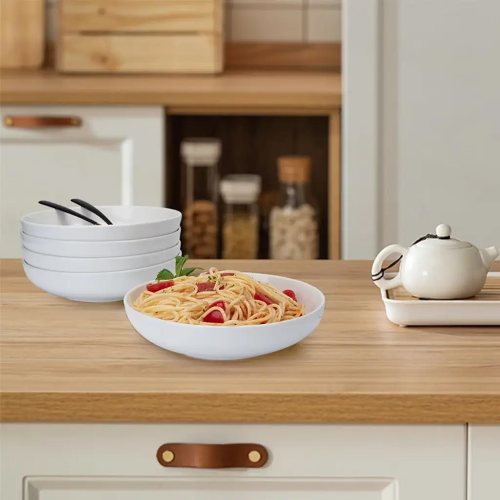 Description:Discover the perfect addition to your kitchen with this Large 8-Inch Pasta Bowls Set of 6, designed to elevate everyday dining and special occasions alike. Crafted from premium, high-temperature fired porcelain, these wide and shallow ceramic pasta bowls combine style, durability, and practicality. Each bowl holds 22 ounces, making them ideal for serving pasta, salads, soups, cereals, and more. Their lightweight yet sturdy construction ensures they are easy to handle for all ages while resisting chips and moisture absorption for long-lasting use. The smooth, flat surfaces prevent stains from sticking, and the stackable design allows for secure, space-saving storage without tipping. Safe for microwave, dishwasher, oven, and refrigerator use, these versatile bowls meet the needs of busy families, restaurants, and entertaining alike. Whether you're hosting a family dinner, serving guests at a party, or looking for a stylish gift, this set of pasta dishes combines elegance and functionality to enhance every meal.