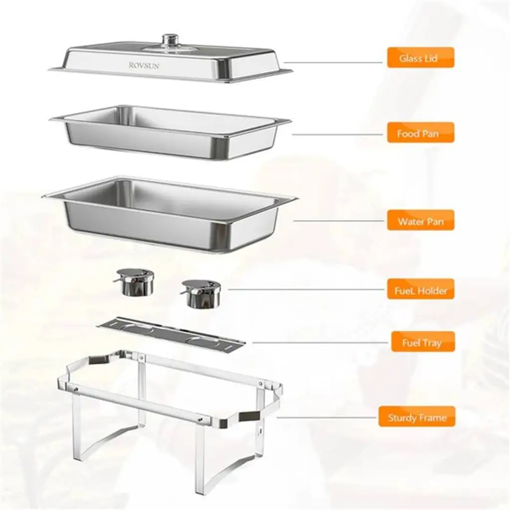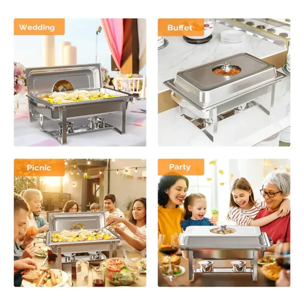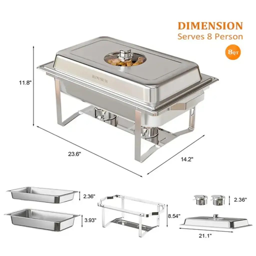 Features:1. Premium Materia: Made of food-grade stainless steel, it features safety and durability. Rust-proof and heat or cold resistant features allow longer service life. Besides, stainless steel construction is easy for cleaning with dish washing liquid and dried with a soft towel.The food pan, water pan and cover are dishwasher safe.2. Maintain Food's Temperature: The frame includes a bottom tray which supports 2 fuel holders to store fuels for heating food, just like someone just turned the stove off. You can also put ice in the water pan if you want to cool down the food.Make sure your food stay as warm as it needs for buffet or events.3. Convenient Glass Window: Features with the visible window which can see what is in the pans without opening the lid. And improving overall presentation and attractiveness while ensuring the food remains uncontaminated.4. Two Sturdy Hooks: We have equipped two sturdy hooks in the back to hold the lid while food in the chafer pan is being . It is perfect for buffets, hotel breakfast and brunch areas, wedding, parties, banquets and any events.5. Complete Set: Offers large serving capacity. Consists of 4 full size food pans, 4 water pans, 8 fuel holders. Overall Size: 23.6''L x 14.2''W x 11.8''H. Food pan size: 21''L x 13'' W x 2.36'' H. Water pan size: 21''L x 13''W x 3.93'' H.Each dish could hold 8 quart, which is enough for party and could serve 8 peoples at most.