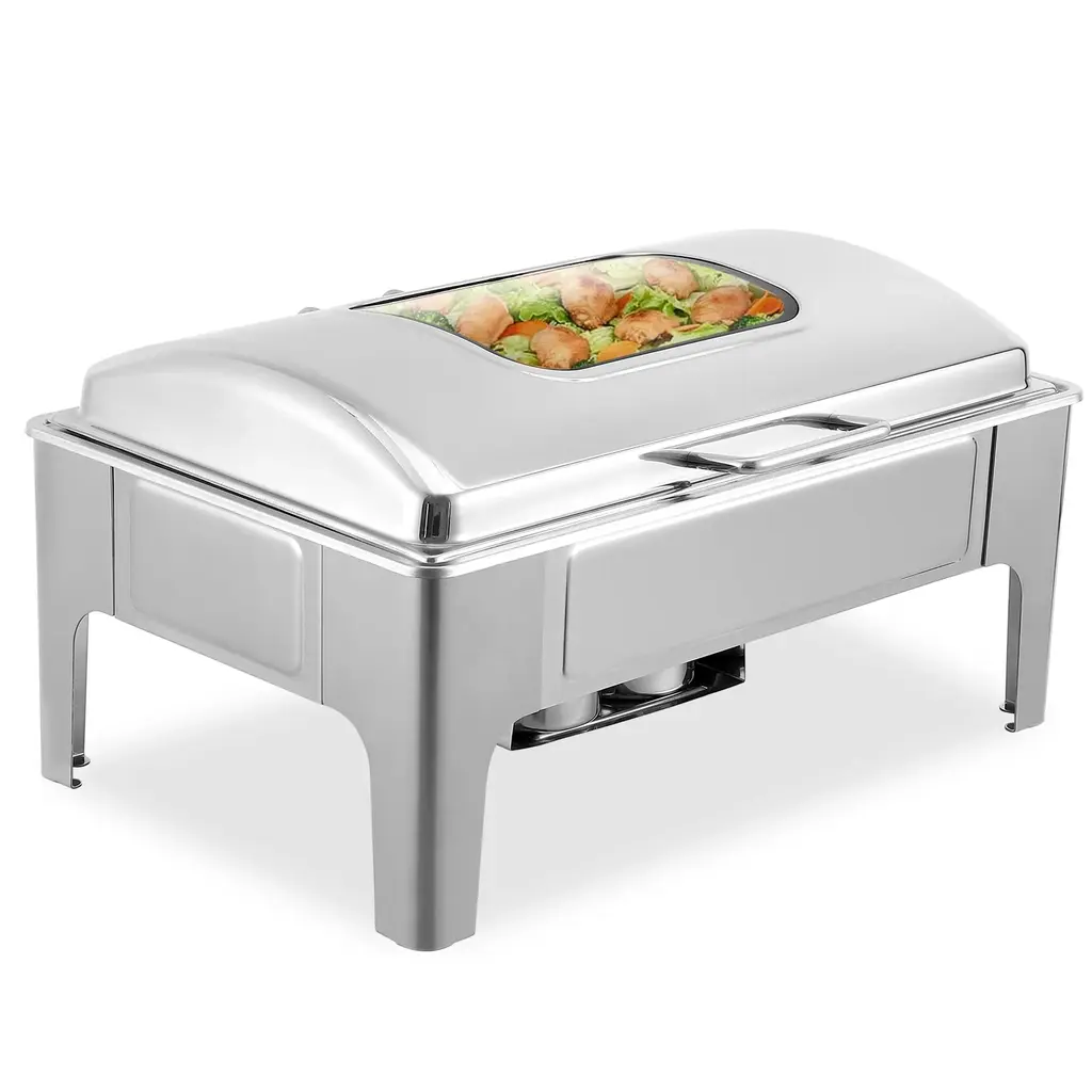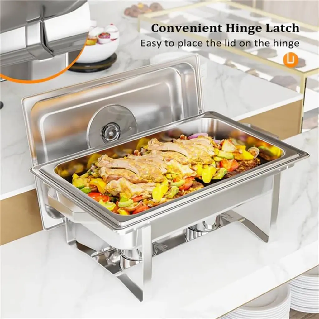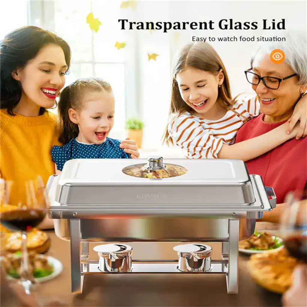 Features:1. Premium Materia: Made of food-grade stainless steel, it features safety and durability. Rust-proof and heat or cold resistant features allow longer service life. Besides, stainless steel construction is easy for cleaning with dish washing liquid and dried with a soft towel.The food pan, water pan and cover are dishwasher safe.2. Maintain Food's Temperature: The frame includes a bottom tray which supports 2 fuel holders to store fuels for heating food, just like someone just turned the stove off. You can also put ice in the water pan if you want to cool down the food.Make sure your food stay as warm as it needs for buffet or events.3. Convenient Glass Window: Features with the visible window which can see what is in the pans without opening the lid. And improving overall presentation and attractiveness while ensuring the food remains uncontaminated.4. Two Sturdy Hooks: We have equipped two sturdy hooks in the back to hold the lid while food in the chafer pan is being . It is perfect for buffets, hotel breakfast and brunch areas, wedding, parties, banquets and any events.5. Complete Set: Offers large serving capacity. Consists of 4 full size food pans, 4 water pans, 8 fuel holders. Overall Size: 23.6''L x 14.2''W x 11.8''H. Food pan size: 21''L x 13'' W x 2.36'' H. Water pan size: 21''L x 13''W x 3.93'' H.Each dish could hold 8 quart, which is enough for party and could serve 8 peoples at most.