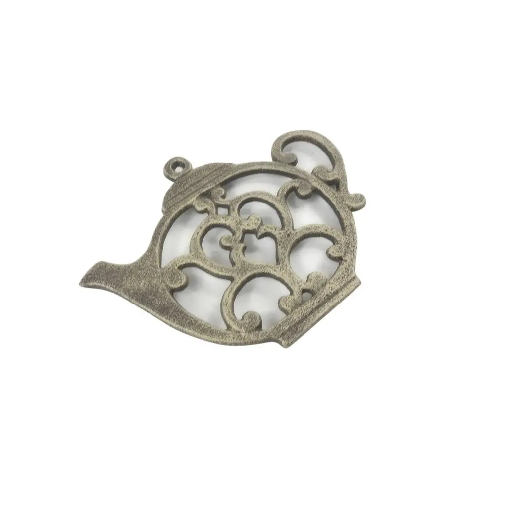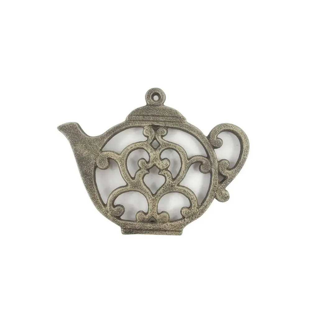 Specification:Dimension:Enhance your kitchen with this cast iron teapot trivet, available in Whitewashed, Red, Rustic Red, Rustic Gold, and Rustic Dark Blue finishes. Measuring 8" L x 6" W x 1" H, this handcrafted trivet adds charm while providing a sturdy surface for teapots, cookware, and serving dishes. Designed with four rubber-covered feet, it stays secure on flat surfaces, preventing scratches and slips. Its intricate detailing makes it a decorative accent, blending function with style. Perfect for everyday use or as a statement piece in any kitchen or dining space.
