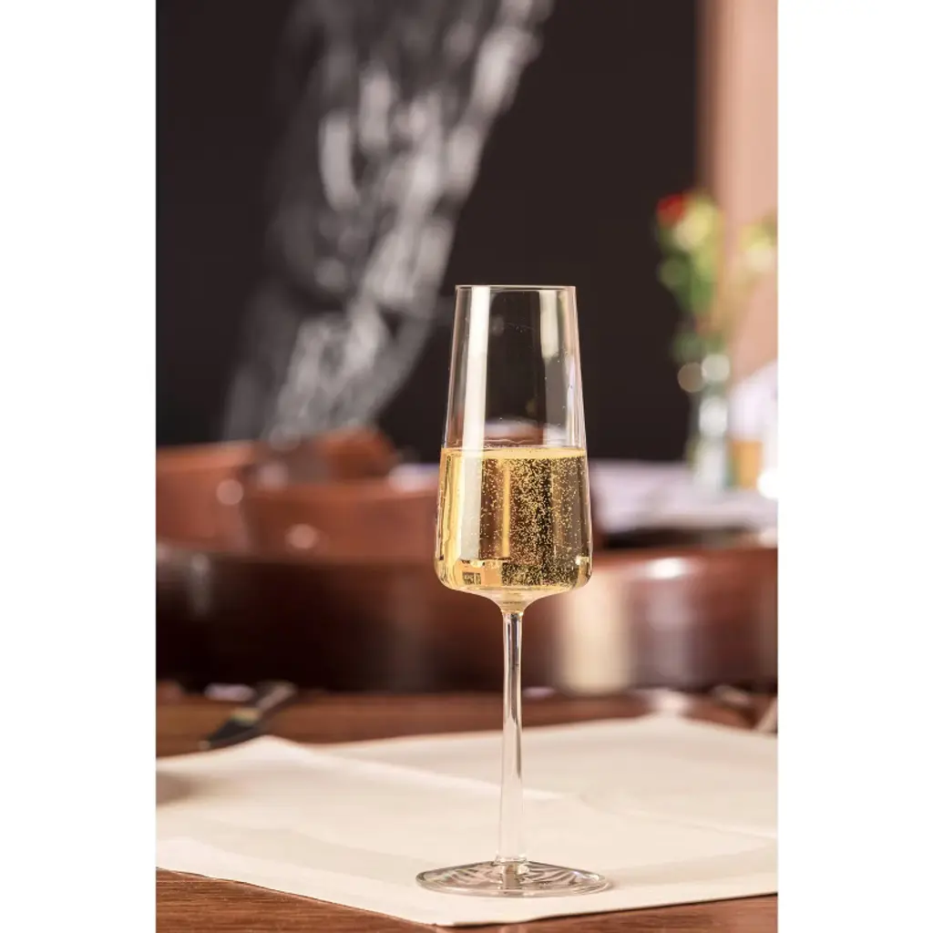 The Power series is characterized by its expressive and puristic shape. The glasses provide wine the maximum amount of surface to allow the wine's aroma and flavor to open up. The funnel shape leads the bouquet of the wine directly to the epicure. The Power collection has been recognized for the contemporary design by winning two prestigious awards in 2018, The German Design Award and the if Design Award. All of the stemmed wine glasses in this range feature pulled stem, meaning the stem is pulled from the bowl creates an elegant line and increase durability. The Power Champagne Flute is 100% lead-free crystal and dishwasher safe. Dimensions are: Height = 226 mm - 9", Bowl Diameter = 72.5 mm - 2-3/4" and Capacity = 240 ml - 8 oz. All Stolzle Champagne Flutes have a sparkling point in the base of the bowl, which helps create the ongoing stream of bubbles in the glass. Made in Germany.