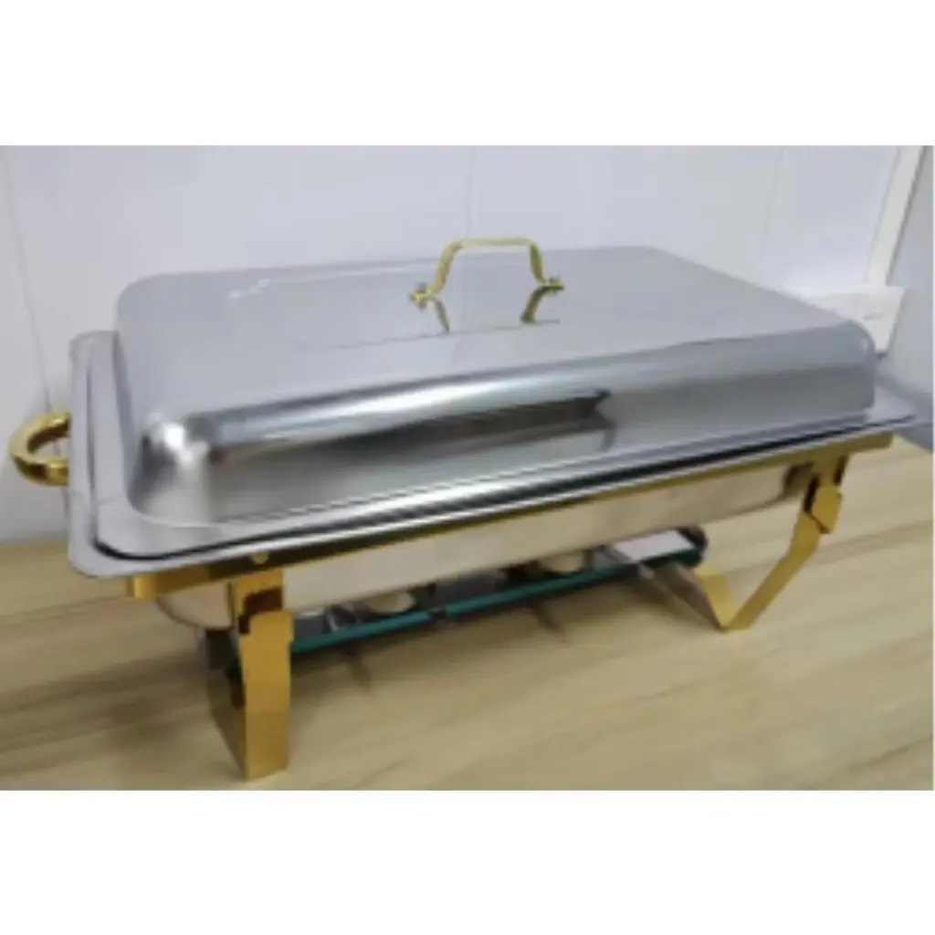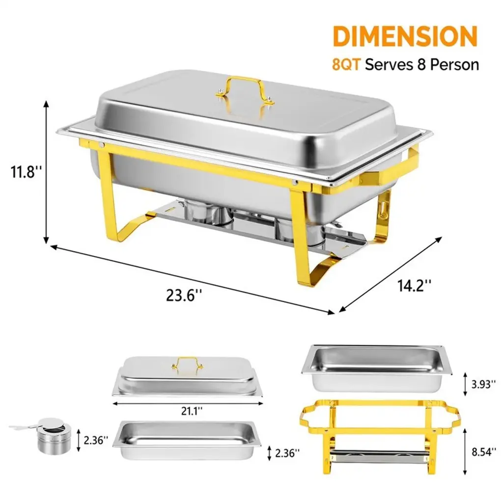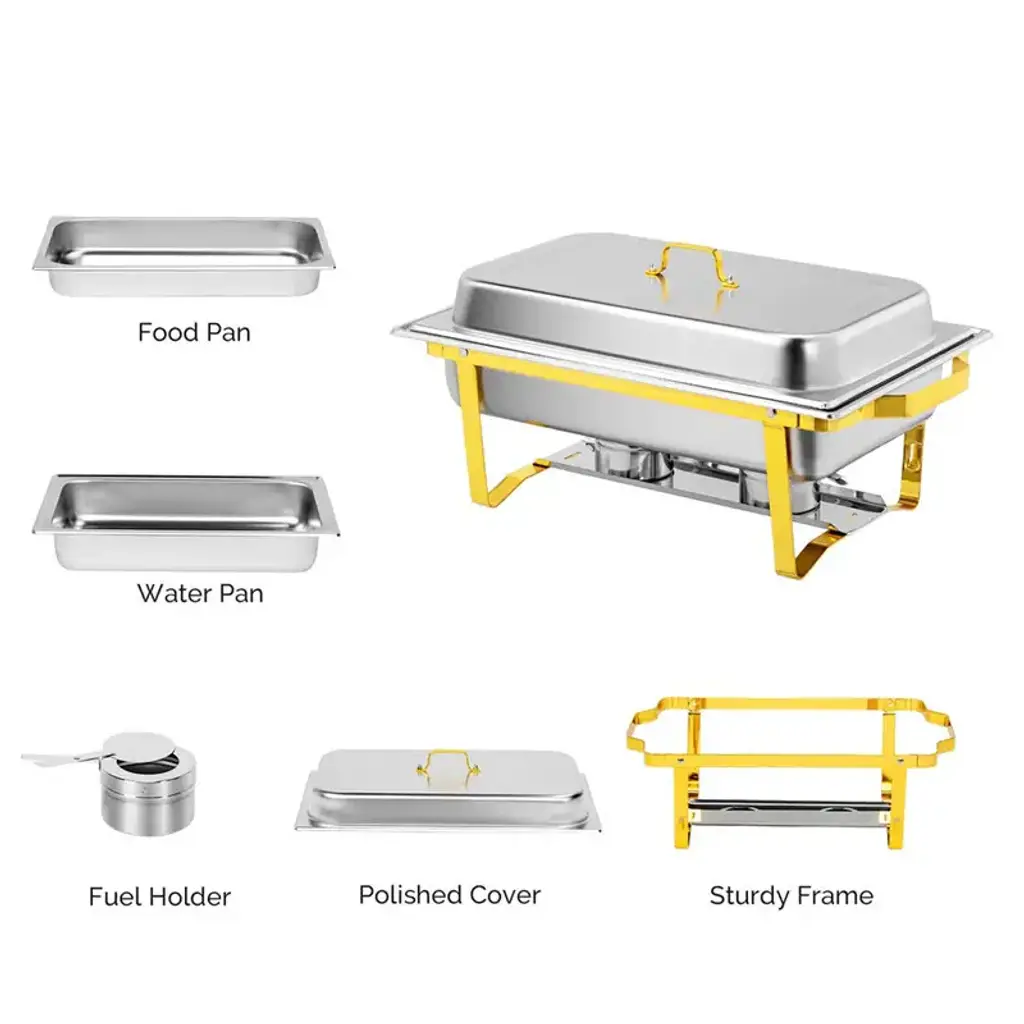 DescriptionCrafted with durability and elegance in mind, this chafing dish is designed to maintain food temperatures effectively, ensuring that your guests enjoy meals at their best. The rectangular shape optimizes space usage on your serving table, while the generous 9-quart capacity allows for ample servings, making it ideal for large gatherings. Constructed from high-quality materials, this chafing dish combines functionality with style, featuring easy-to-clean surfaces and a sleek design that complements any setting. Whether you're hosting a formal dinner party, a casual get-together, or a professional catering service, this 9 QT Rectangle Chafing Dish will be an indispensable tool in your culinary arsenal. FeaturesPremium Materia: Made of food-grade stainless steel, it features safety and durability. Rust-proof and heat or cold resistant features allow longer service life. Besides, stainless steel construction is easy for cleaning with dish washing liquid and dried with a soft towel.The food pan, water pan and cover are dishwasher safe. Gold Chafing Dishes: Features with gold & silver design create a textured metal sense,elegantly display catering food straight from the oven onto the buffet table. Perfect for restaurant or hotel commercial use. Maintain Food's Temprerature: The frame includes a bottom tray which supports 2 fuel holders to store fuels for heating food, just like someone just turned the stove off. You can also put ice in the water pan if you want to cool down the food.Make sure your food stay as warm as it needs for buffet or events. Two Sturdy Hooks: We have equipped two sturdy hooks in the back to hold the lid while food in the chafer pan is being. Widely used to buffets, hotel breakfast and brunch areas,wedding,parties,banquets and any catering events.