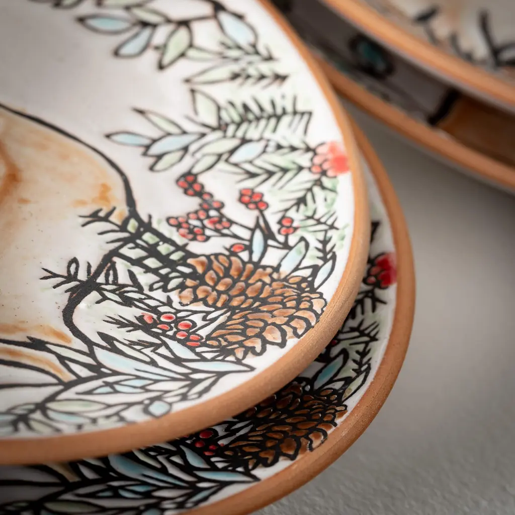 These festive snack plates add woodland wonder to your holiday entertaining. Embossed with textured images of deer, foxes and holly berries, they set a rustic yet refined tablescape that feels perfectly at home during Christmas. Crafted with a careful eye, these four plates offer a natural foundation for appetizers, desserts or breakfast bites, while their embossed designs add subtle visual interest. Set the stage for memorable Christmas entertaining with plates that celebrate the simpler pleasures of the season and the joy of coming together. • Charming Embossed Woodland Snack Plates: Elevate your holiday entertaining with this set of embossed woodland snack plates, featuring a charming design inspired by the beauty of nature during Christmas. • Quality Ceramic Construction: Crafted from durable ceramic, these plates offer both functionality and style, making them perfect for serving appetizers, desserts, or snacks during your festive gatherings. • Generous Size for Serving: Measuring 1 inch tall x 9 inches wide x 9 inches long, these plates provide ample space for arranging a variety of delicious treats, ensuring a delightful dining experience for your guests. • Versatile Multicolor Design: With their vibrant multicolor design and intricate embossed woodland motif, these plates complement any Christmas decor theme, adding a touch of rustic elegance to your holiday table setting. • Set of 4 Plates: This set includes four embossed woodland snack plates, making it easy to entertain family and friends during the festive season while adding a festive flair to your holiday tableware collection. • Experience Timeless Elegance with Sullivan's Home Decor - Celebrating Over 55 Years of Excellence! Explore our extensive collection of quality products, meticulously curated to suit every style, season, and occasion. From classic designs to on-trend accents, Sullivan's Home Decor seamlessly blends tradition with modernity, ensuring there's something special for everyone. Transform your living spaces with our enduring commitment to style and sophistication. • Each piece measures 9"L x 9"W x 1"H