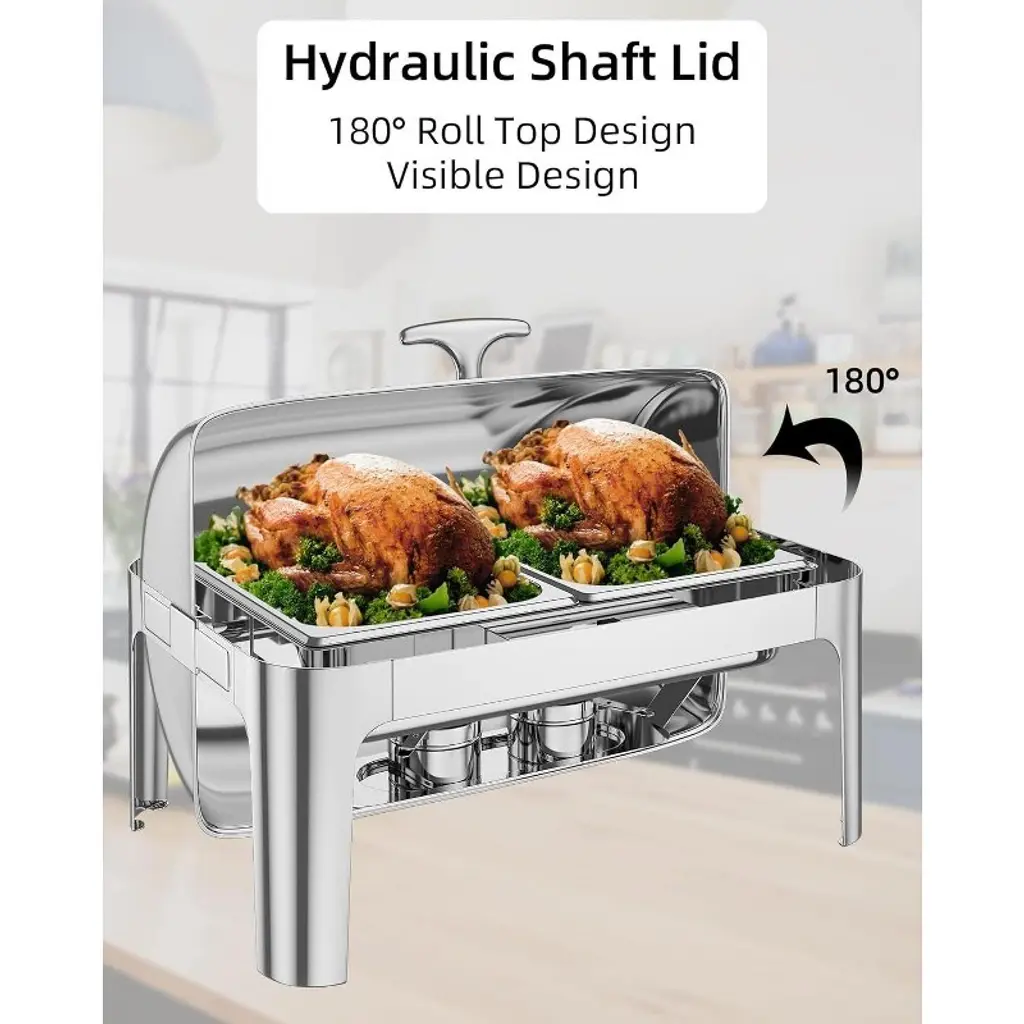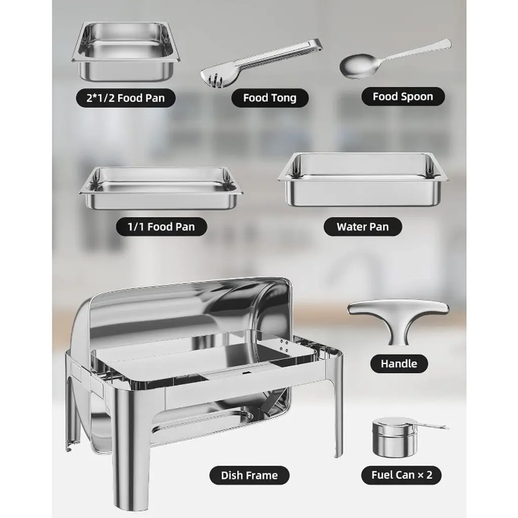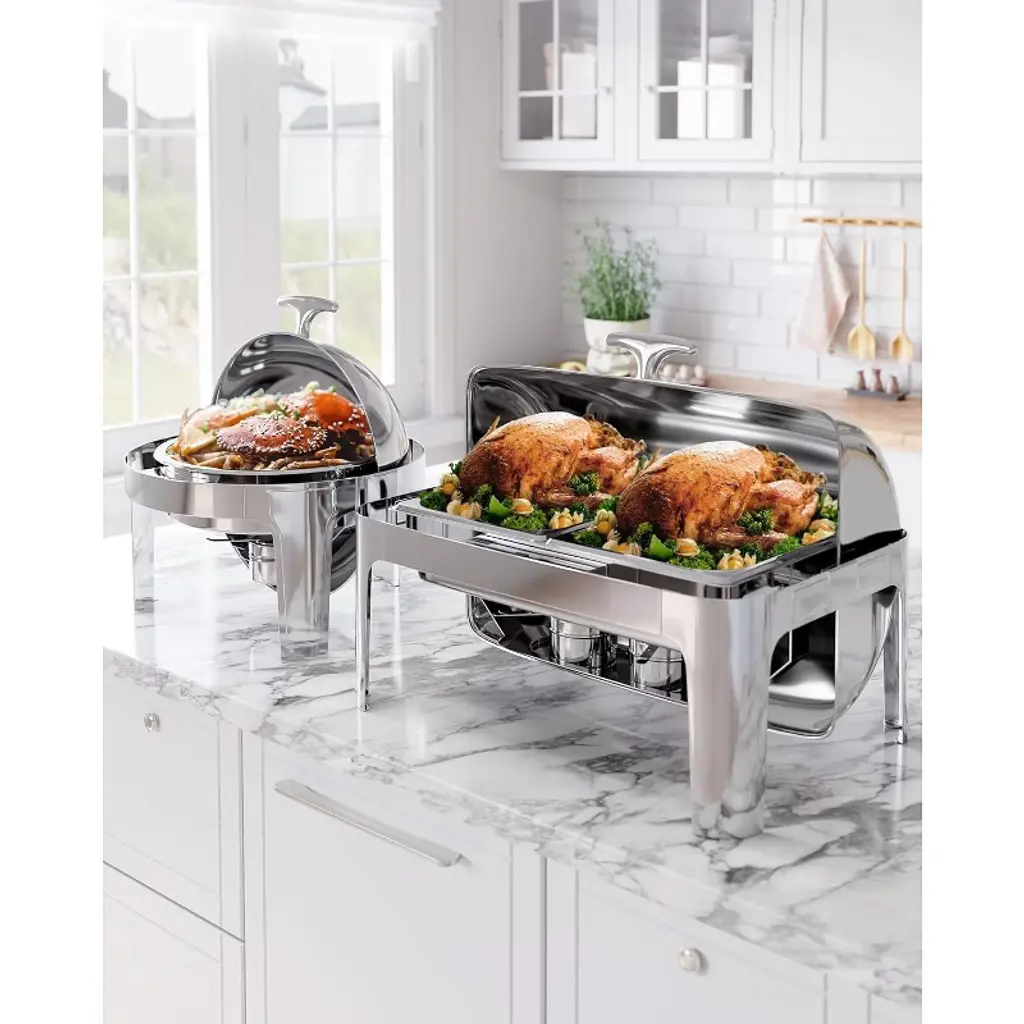 Introducing the 9QT Chafing Dish Buffet Set, a premium stainless steel food warmer and server designed to elevate your catering experience. Perfect for parties, weddings, hotels, and any large gatherings, this versatile chafing dish set ensures your food stays hot and fresh throughout your event. Crafted from durable stainless steel, this buffet set includes one full-size pan, ideal for serving a variety of dishes. The high-quality steel construction guarantees long-lasting performance and easy cleaning, making it a reliable addition to your kitchen or catering supplies. This chafing dish buffet set features a roll-top lid for convenient access while maintaining temperature and hygiene. Its sleek design not only adds a professional touch to your buffet but also fits seamlessly into any kitchen or serving area. Whether you are hosting a wedding reception, a hotel banquet, or a casual party, this chafing dish set is designed to meet your needs. The full kitchen set includes all essential components such as pans and roll-top chafing dishes, providing a complete solution for food warming and serving. Key Features: - Durable stainless steel construction for longevity and easy maintenance - 9QT capacity with one full-size pan, perfect for large servings - Roll-top lid design for easy access and heat retention - Ideal for parties, weddings, hotels, and catering events - Complete kitchen set including pans and chafing dishes Upgrade your buffet setup with this reliable and stylish 9QT Chafing Dish Buffet Set, designed to keep your food warm and your guests satisfied. Experience the convenience and elegance of professional-grade serving equipment that meets all your catering needs.