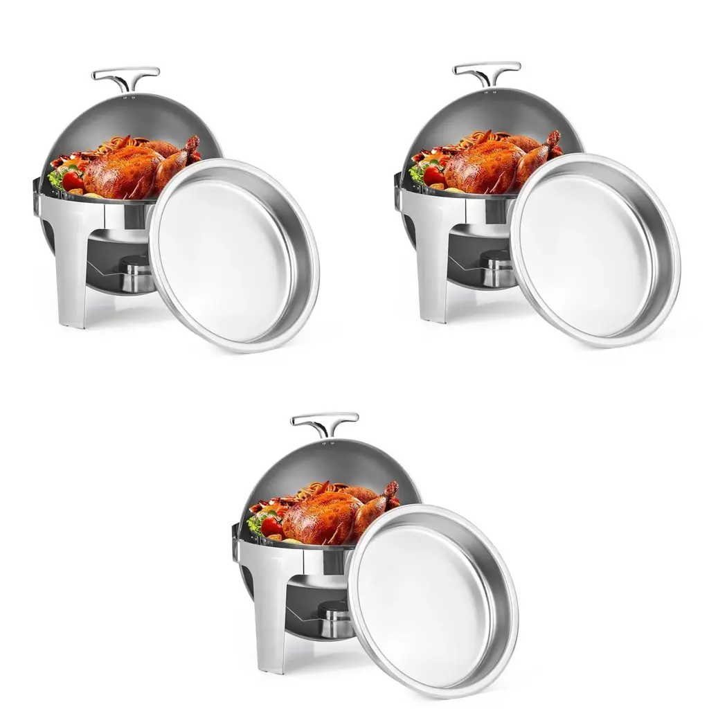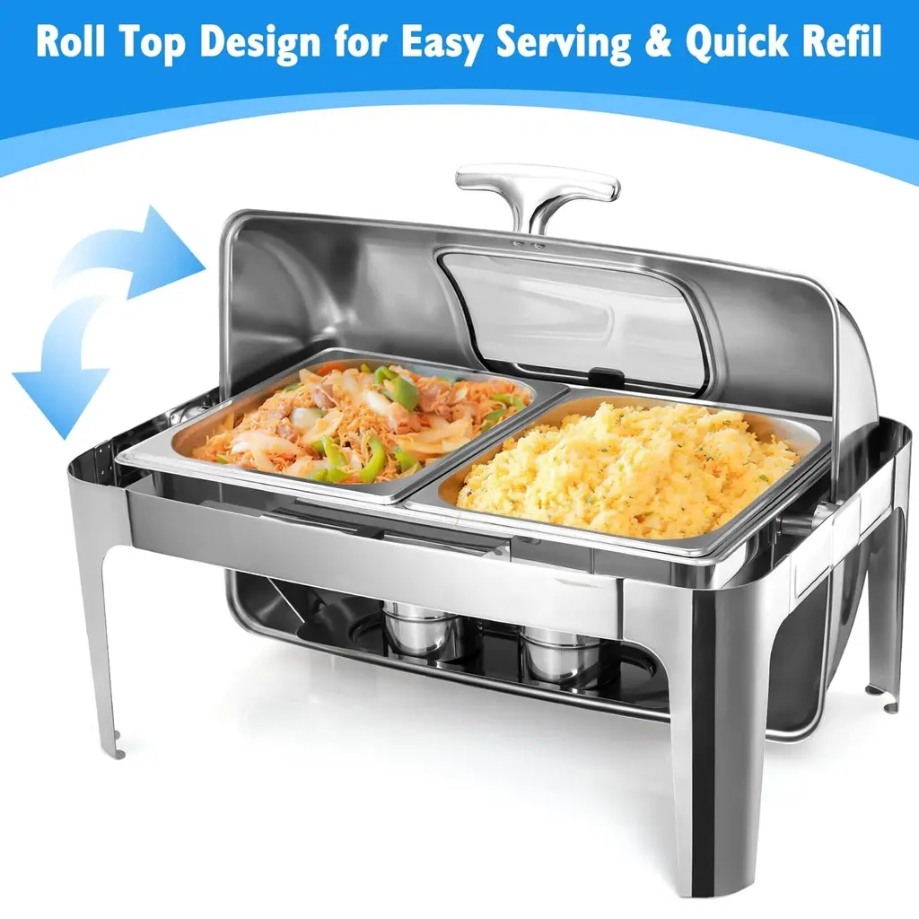 Premium Stainless Steel Material: The roll top chafing dish buffet set is made entirely of high-quality stainless steel. This not only ensures durability but also makes it easy to clean and maintain. The stainless steel construction is resistant to rust, corrosion, and staining, ensuring a long-lasting and hygienic product for your buffet or catering needs. Soft Open and Close without Noise: The upgraded bearing mechanism in our roll top chafing dish buffet set allows for smooth and quiet opening and closing of the roll top lid. This ensures a seamless and noise-free dining experience for your guests. The chafing dish handles also ensure easy and ergonomic mobility, making it convenient for servers to transport and serve food. Generous Capacity: With two half-size food pans, the roll top chafing dish buffet set provides a generous capacity of up to 9 quarts. This spacious design allows you to serve a variety of piping hot appetizers, entrees, or side dishes for a group of approximately 5 people. The roll top cover allows for safe and easy access by staff and guests, promoting convenient self-service or assisted serving. Easy to Clean: The roll top chafing dish buffet set is designed for easy cleaning. The stainless steel construction is resistant to food stains and odors, making it easy to wipe clean with dishwashing liquid and a soft towel. The detachable pans can be cleaned separately, and for added convenience, the food pan, water pan, and cover are dishwasher safe. This makes cleanup a breeze after use, saving you time and effort. Versatile Warming and Cooling: The chafing dish buffet set can be used for both warming and cooling purposes. The fuel burning feature keeps food warm for extended periods, ensuring it remains at a safe serving temperature. Additionally, the roll top chafing dish can also be used with ice cubes, for keeping food fresh. This versatility makes it suitable for catering events, buffet setups, restaurants, hotels, and various other occasions.