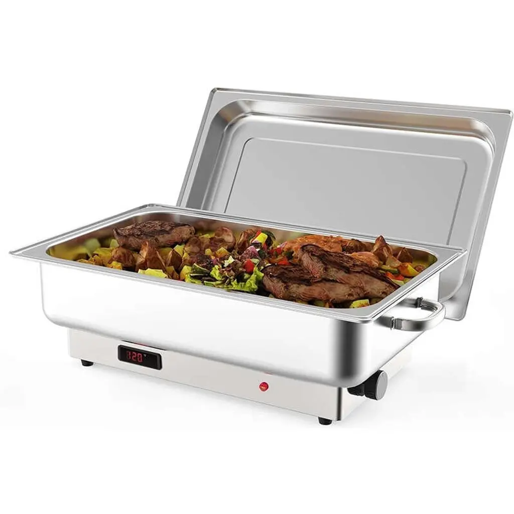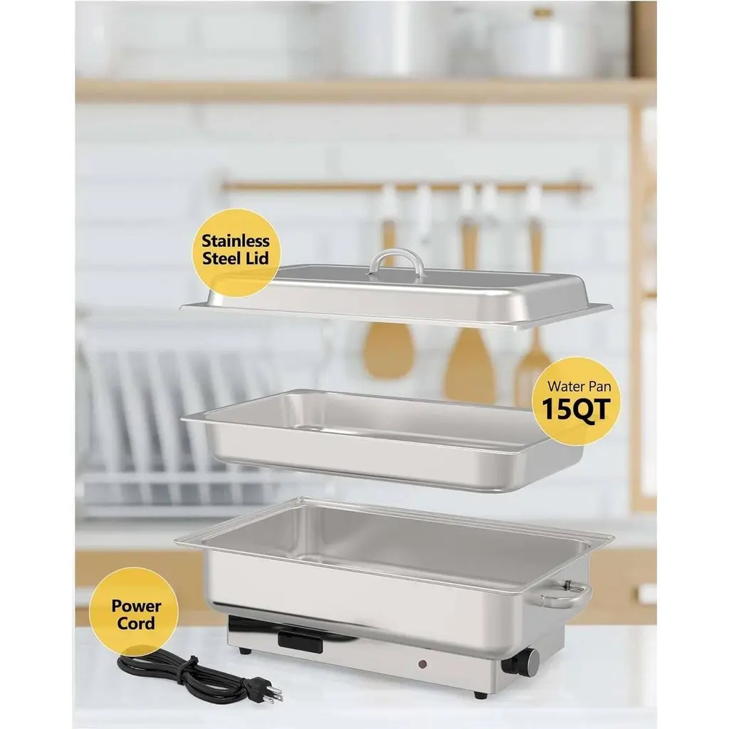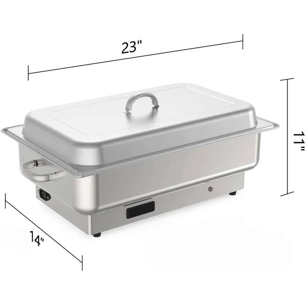 🔥【Dimension & Large Capacity】Size:23"x 14"x 14", 15QT water pan, 9QT food pan (2.6 in deep) can serve at least 8 people. More convenient for your use.🔥【Temperature Control & Display】Powered by a 400W built-in heating element, after fill the water pan with water, it can be easily adjust the thermostat between 86°F and 200°F(30°C and 93°C) to suit your food service requirements, low power consumption higher efficiency.🔥【Food Grade Stainless Steel Pan & Lid】Warming trays for buffets party is made of food grade stainless steel with a 1/1 NSF-certified food pan. Also the lid is.🔥【Electric Food Warmers Package Contains】Integrate water pan * 1, Full-size food pan * 1, PC Lid * 1, Power cable * 1, Instruction manual * 1.🔥【Wide Application Chafing Dish】Large capacity electric chafing dish can serve a lot of guests, it is a good choice for hosting parties and holiday dinners. Such as catering, parties, restaurants, buffets, hotels, wedding brunches.