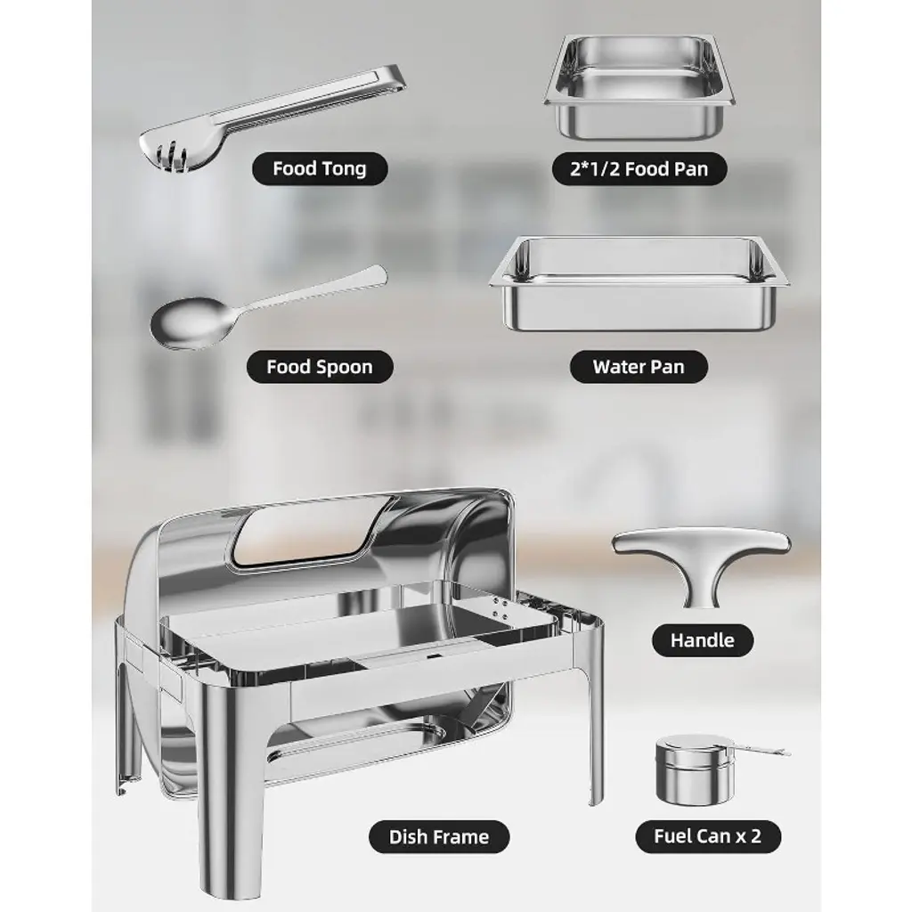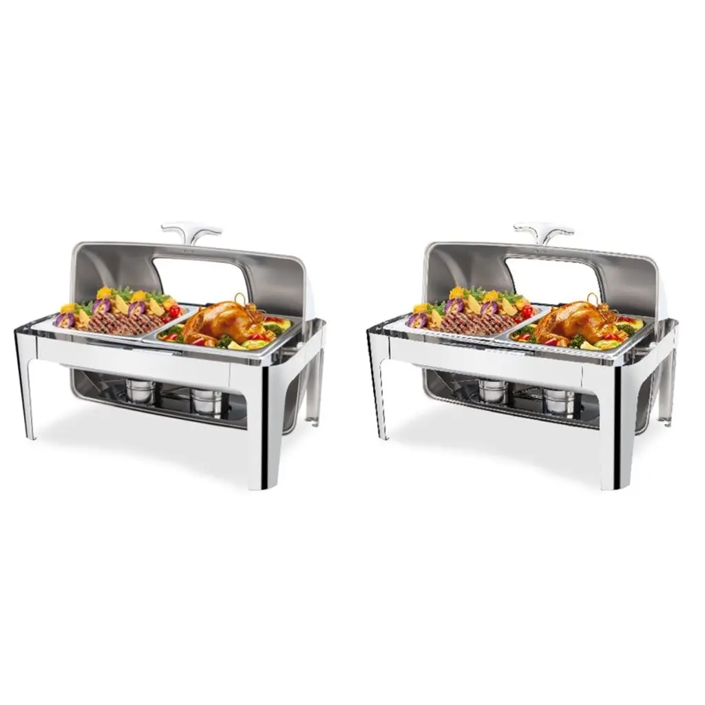 9Qt Stainless Steel Rectangular Roll Top Chafing Dish Buffet Set, Includes 2 Half Size Pans, Visible Lid, For Catering, Weddings, Parties