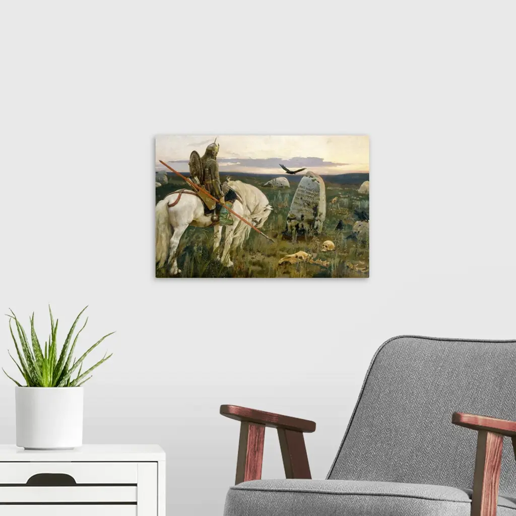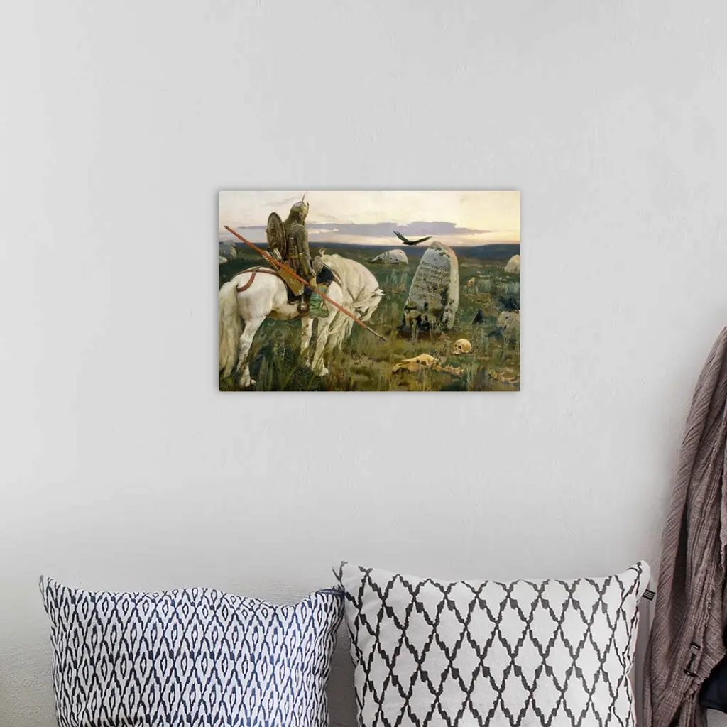 1882, oil on canvas. State Russian Museum, St. Petersburg, Russia. Illustrates a common Russian folk tale of a hero choosing between two bad possibilities (the menhir or stone states either go left and lose your horse, or go right and lose your head).