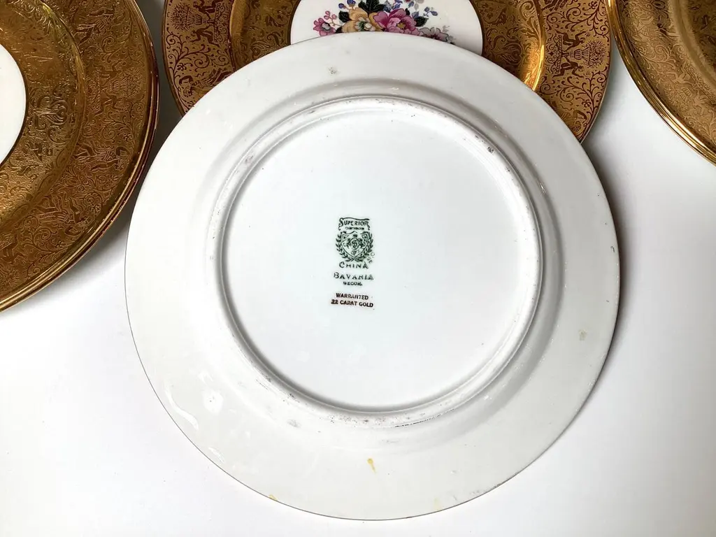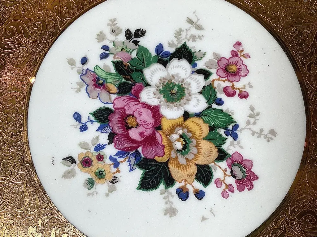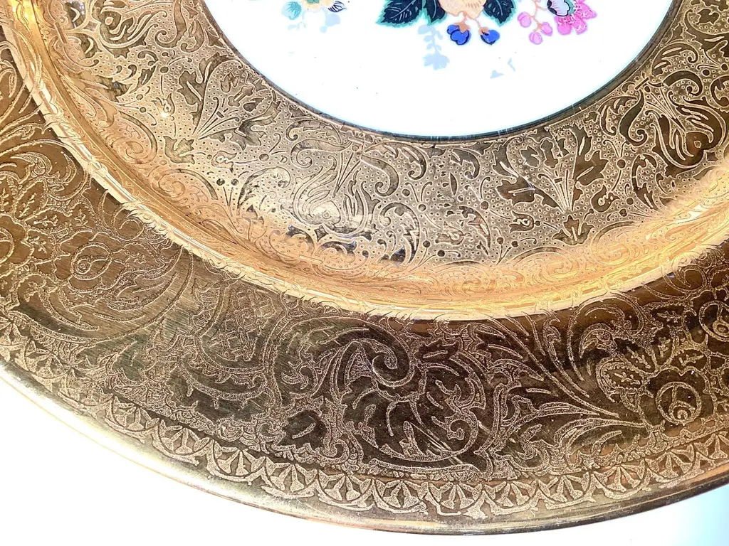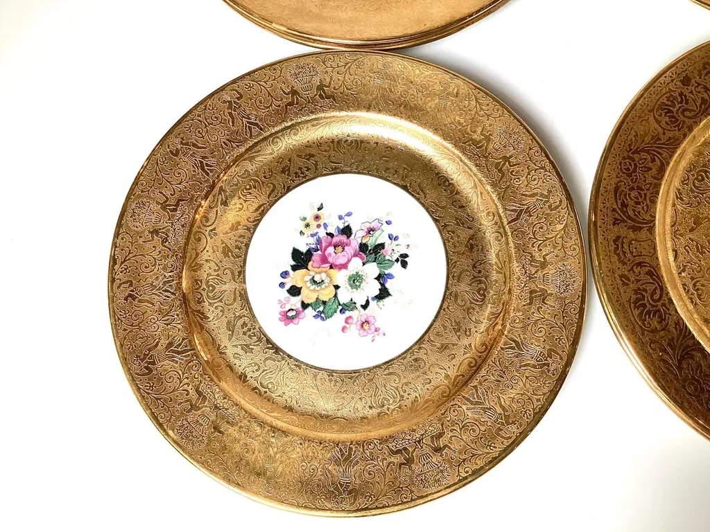 A set of 12 elaborated gold and floral service plates. The plates with a broad 22 k gold border with a bouquet of Dresden floral centers. The plates make for an elegant table or a stunning display in a cabinet. 10.25 inches in diameter