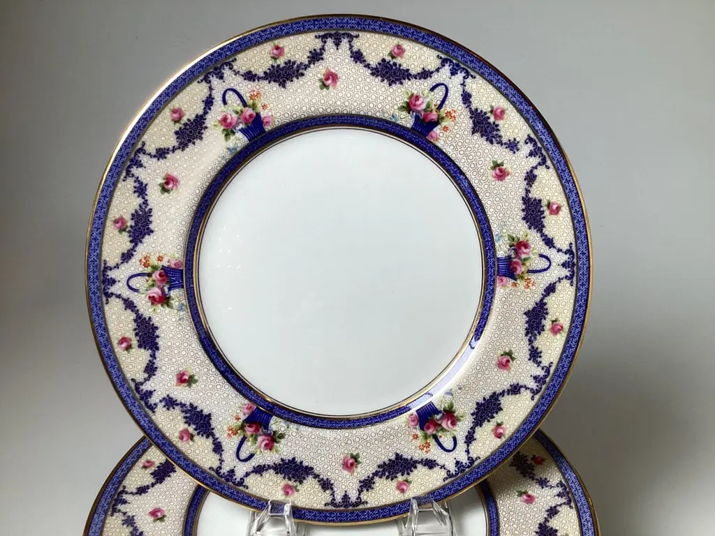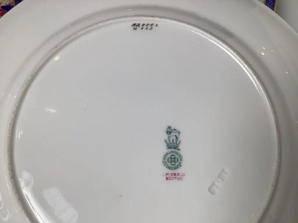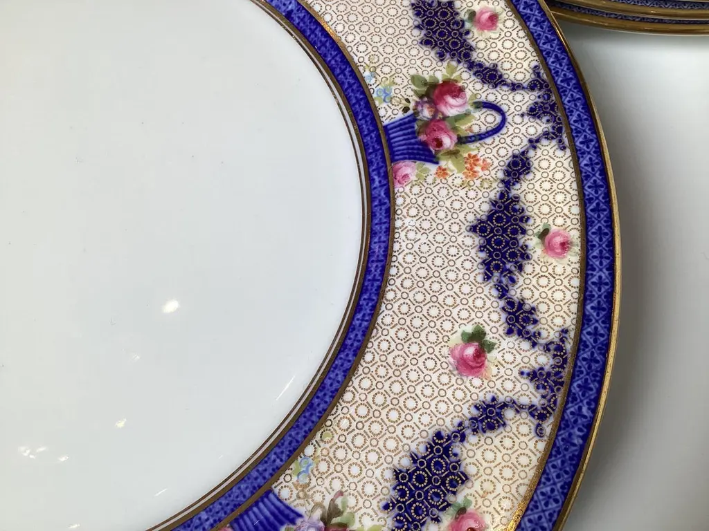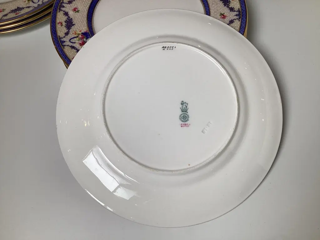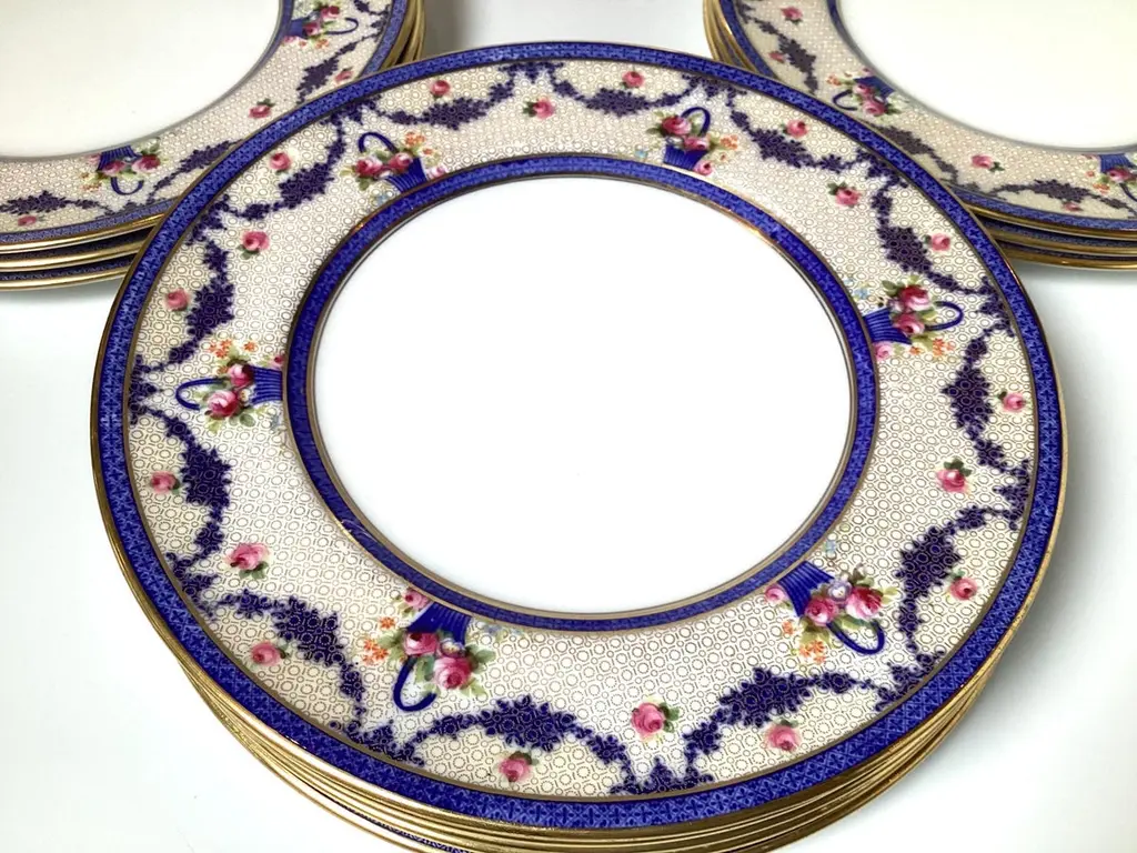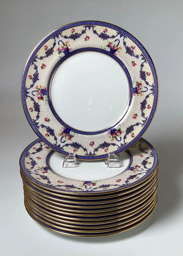 This set of twelve dinner plates are Royal Doulton, a renowned English ceramic and home accessories manufacturer. The mark on the back indicates they were made in England and sold through J.M.D.& S.Co., a Boston based distributor.The intricate floral and geometric patterns, along with the gold detailing, suggest these plates are from a high quality collection, likely early 20th century.