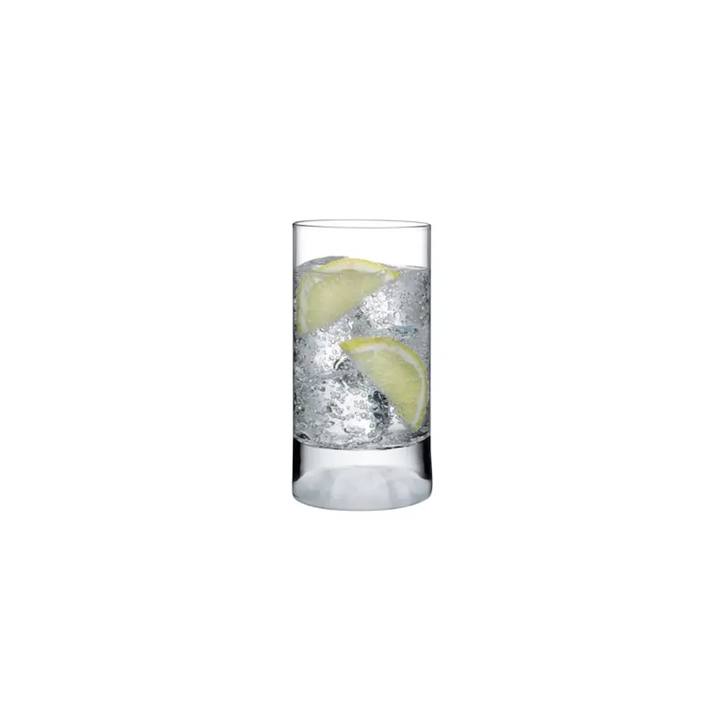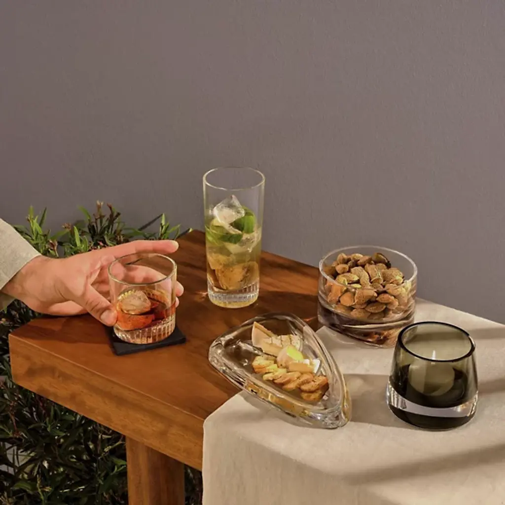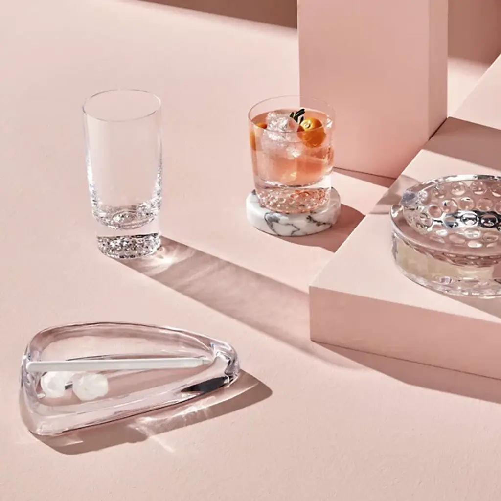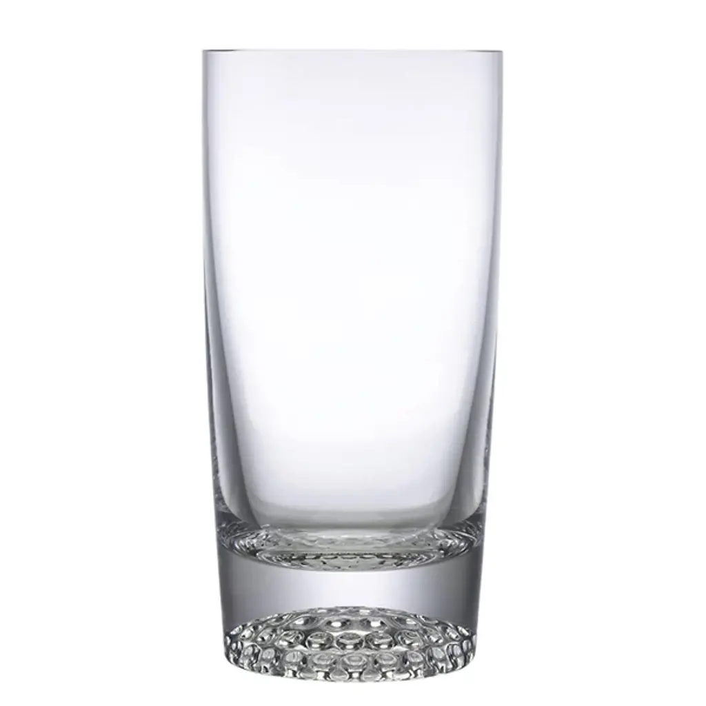 The Ace Highball Glasses, Set of 2 from Nude features golf ball-inspired dimpled patterns etched into its solid curved bases for distinctive texture. Created by the Nude Design Team and handmade in Turkey from lead-free crystal, the textured lower section contrasts beautifully with smooth walls above. The playful surface detail adds tactile interest while maintaining practical functionality for mixed drinks and cocktails.