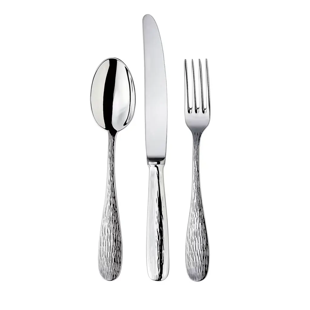 This dainty set of dessert cutlery will be a captivating addition to a personal silverware collection. This 18-piece silverware set is composed of six pairs of forks and knives with a hammered handle that evokes the surface of rippling water, adding visual and textural depth to this everyday object. The sleek and ergonomic design allows for easy and elegant use. This set is in silver-plated metal (base in brass or copper) using an electroplating galvanic process.