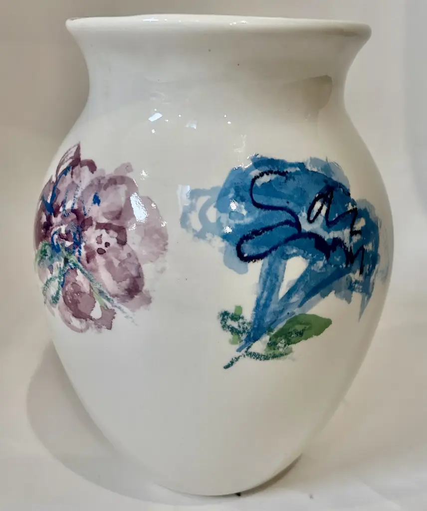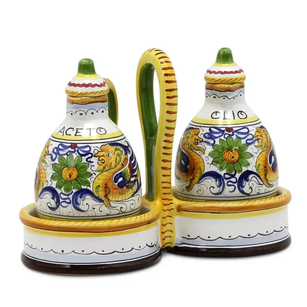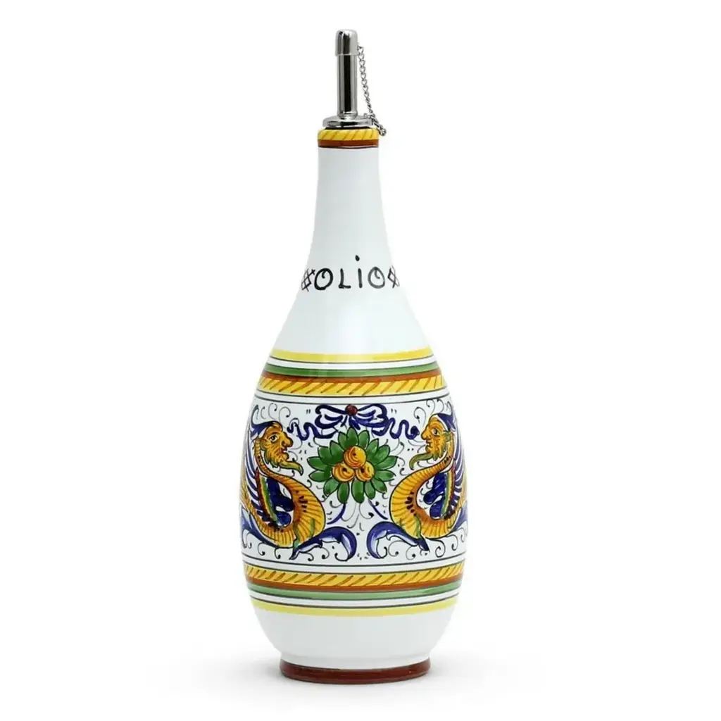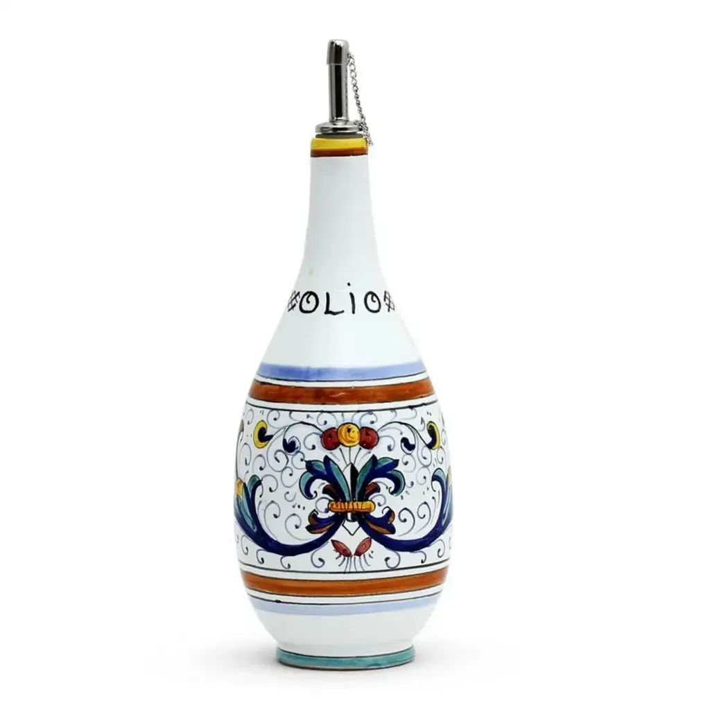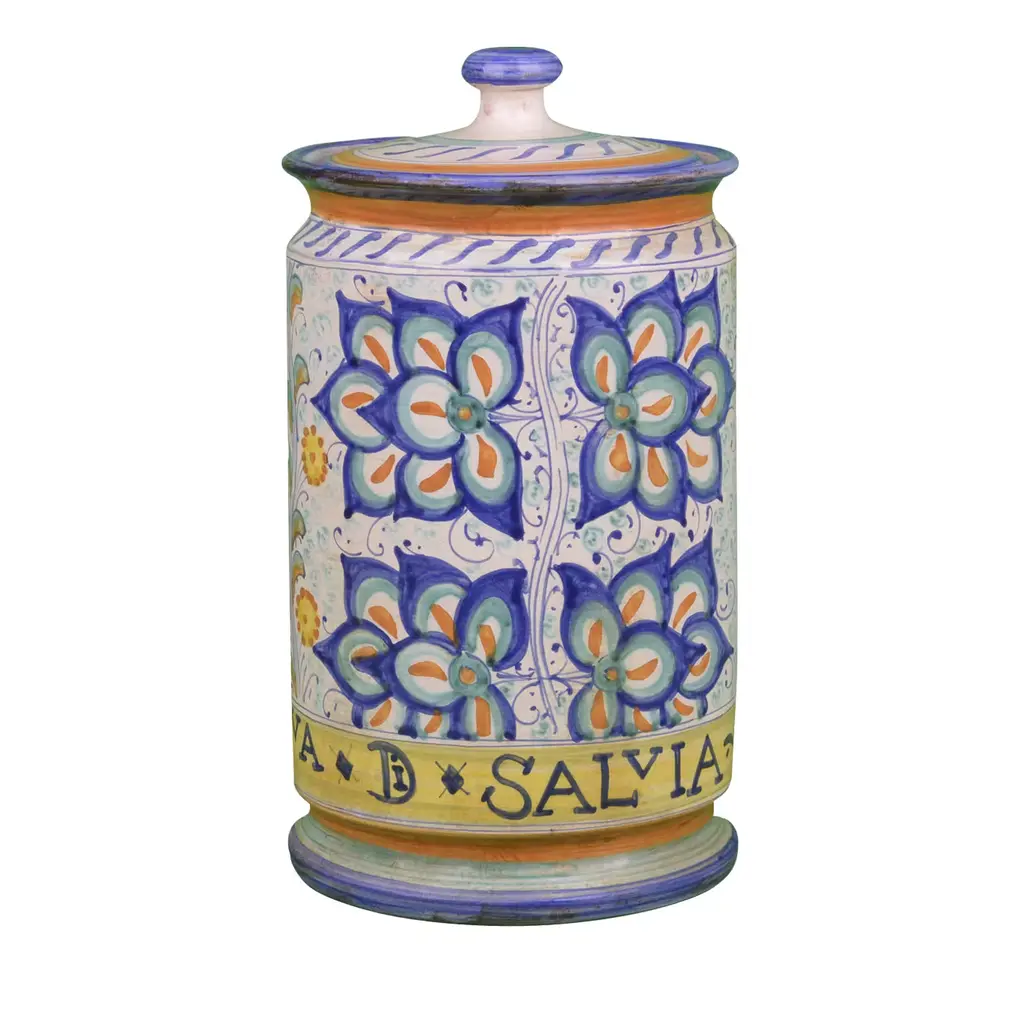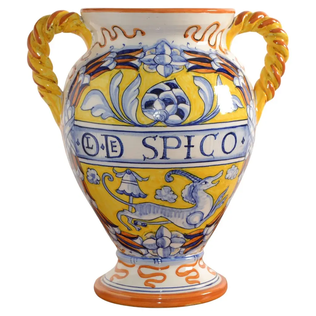 This superb piece of master ceramic craftsmanship is inspired by antique apothecary containers of medicinal flower essences, in this case "broom flower water". With its traditional silhouette, detailed handle, and spout, this exquisite object d'art is completely handcrafted, glazed, and painted in hues of blue on a classic white background, typical of the finest Florentine majolica. Showcasing stunning geometric and floral patterns, with a central classic lettering highlighting its contents, this distinctive piece will make a remarkable impact in any refined space. For decorative use only.