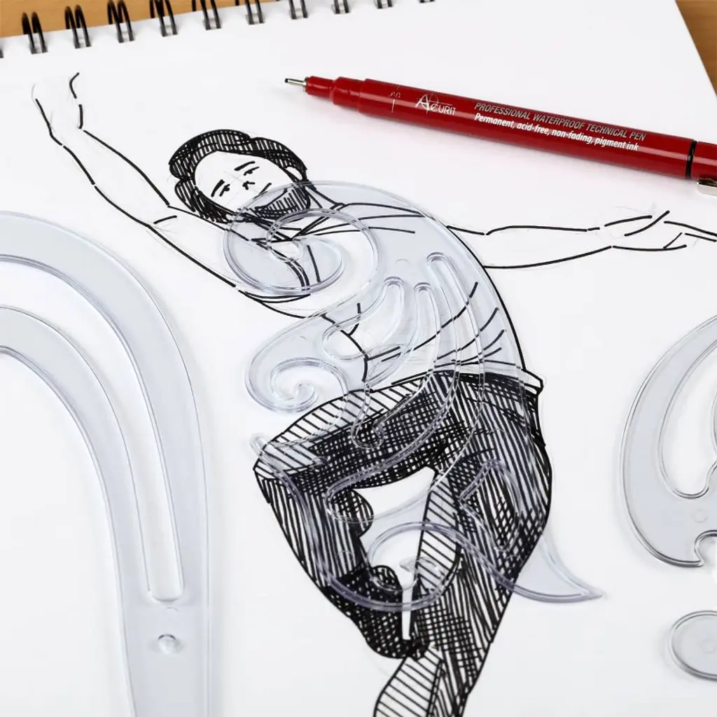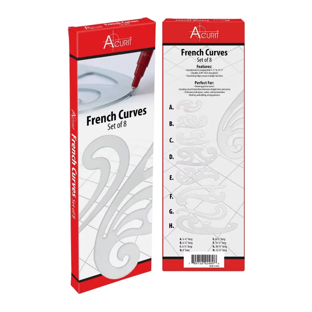 Enhance your design precision with Acurit's professional French Curve Set of 8. Whether you're working in fashion, architecture, or graphic arts, these drafting templates help you create smooth, accurate curves with ease. Made from transparent 0.08" thick plastic, each template allows you to see your work beneath the tool while drawing. The dual inking edges help ensure clean, smudge-free lines, making them perfect for both pen and pencil use. This set includes 8 different sizes: 5-1/4", 6-1/2" (x2), 8", 8-1/2", 10-1/4" (x2), and 12-1/2", covering a full range of curve profiles. Use them to connect plotted points, refine hand-drawn arcs, or draft sewing patterns and construction plans with smooth transitions. Perfect for graphic designers, architects, fashion designers, woodworkers, interior designers, engineers, and anyone working with patterns or freehand designs. These curves are the essential analog tool for modern creatives.