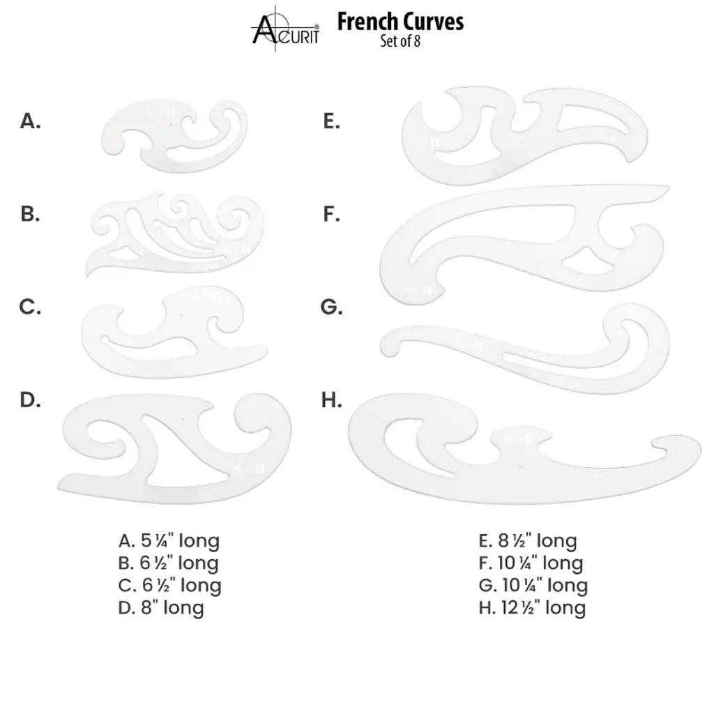 Acurit French Curve Set Of 8 – Clear Plastic Drawing Templates For Sewing, Pattern Making, Drafting, Fashion Design, Architecture, Graphic