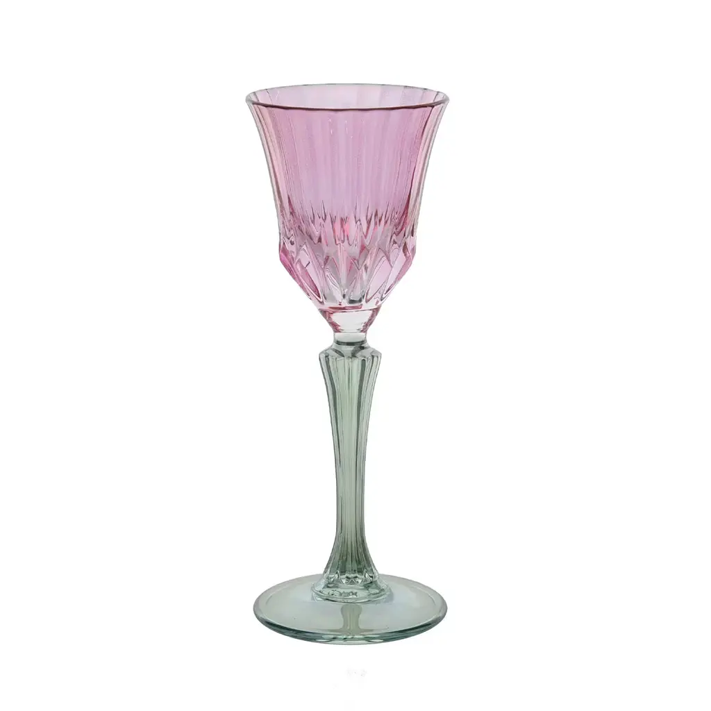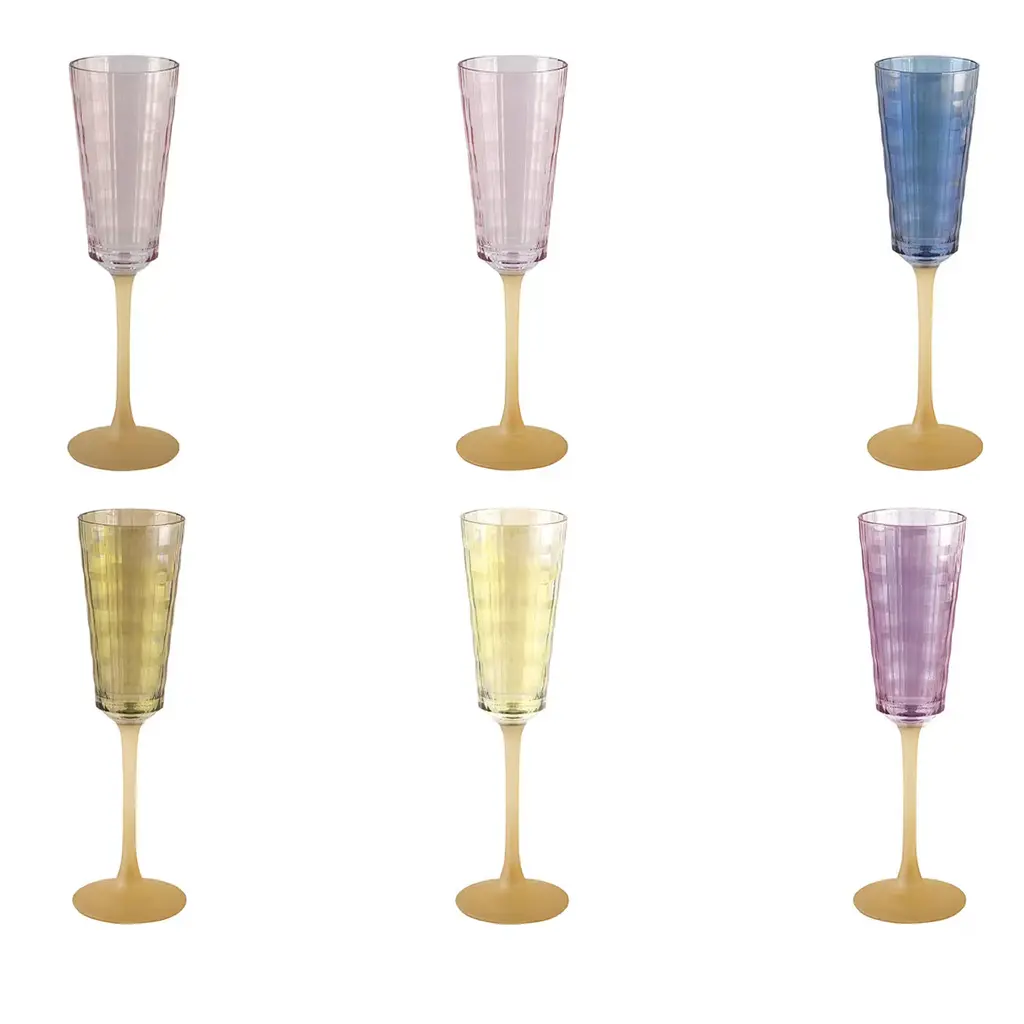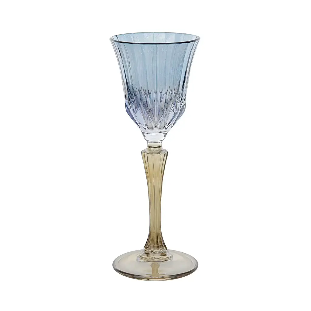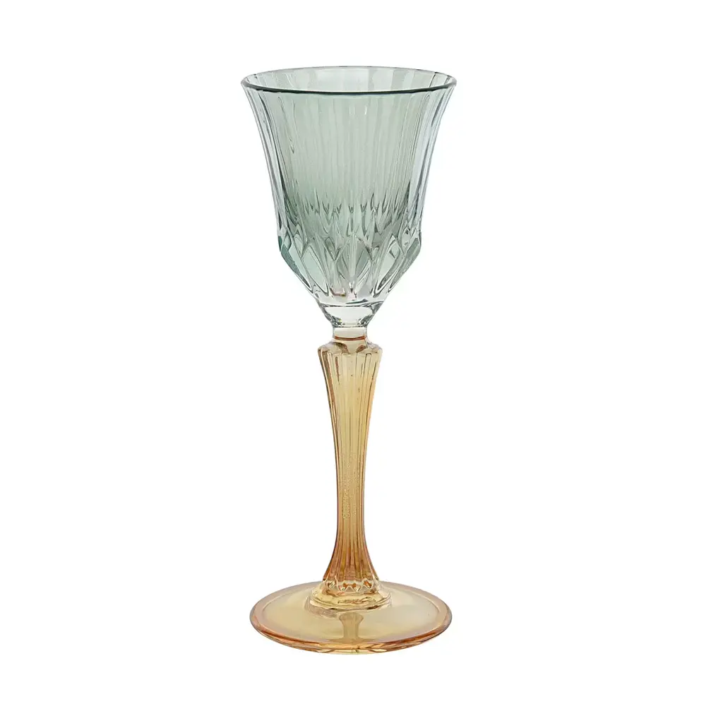 Vibrantly and elegantly colored, this set of six spirit glasses will be a stunning addition to both traditional and modern homes, infusing a dining table with subtle sophistication. Exquisitely handcrafted of mouth-blown glass, each piece combines two different hues enhancing the brilliant flair of the tall and refined stem and of the grooved and flared bowl, respectively.