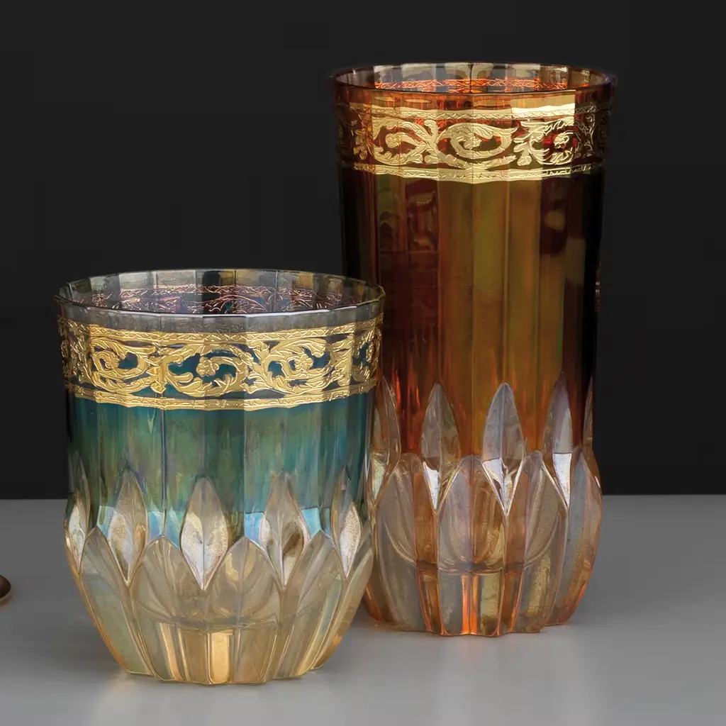 Comprised of two water glasses and two soft drink glasses, this gorgeous set will add a captivating and opulent character to a dining table in both modern or traditional interiors. Handcrafted of glass, each piece features a refined decoration painted by hand with gold. Respectively enhanced with subtle, mesmerizing shades of emerald green and amber, these water and soft drink glasses are also defined by a striking textural allure.