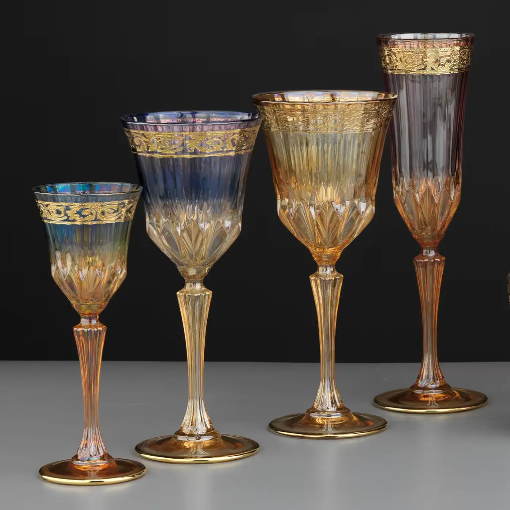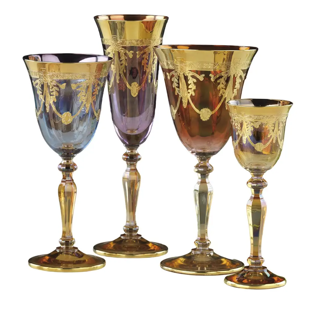 Perfect for contemporary and traditional homes alike, a timeless aesthetic defines this lavish set of four mixed glasses. Comprised of a water glass, a wine glass, a liquor glass, and a flute, each piece is handcrafted of glass showcasing a different gradient tone, and adorned with a gold ornament painted by hand.
