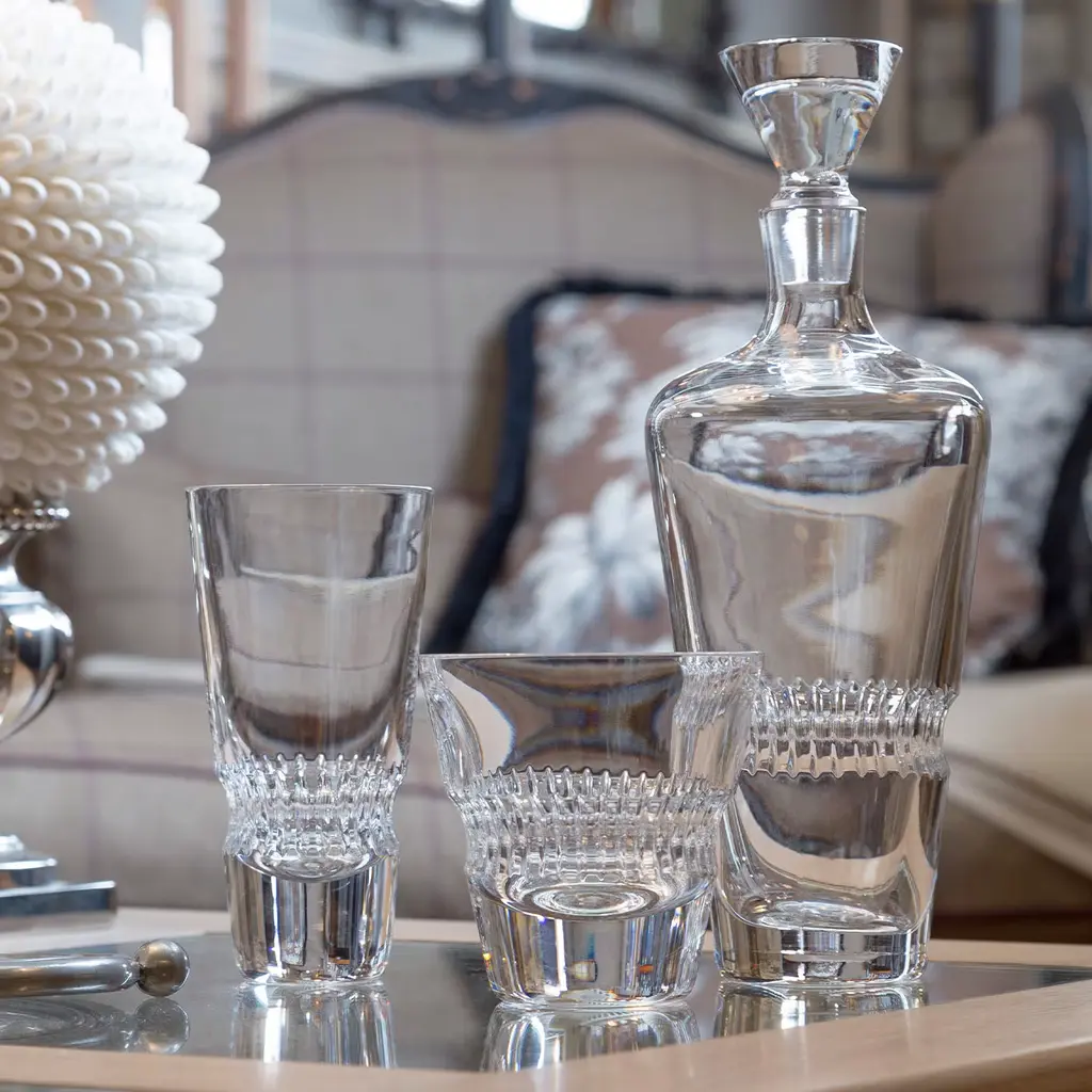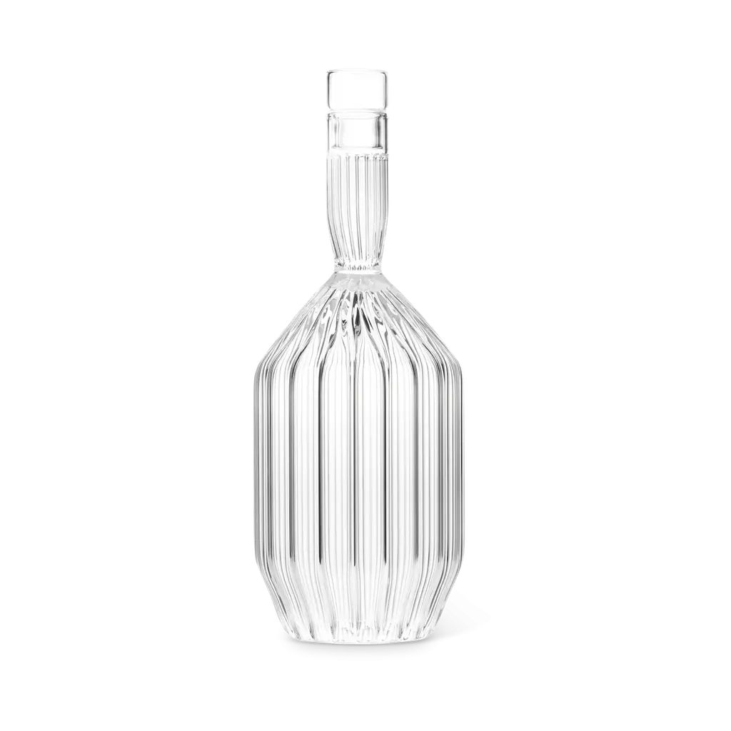 Elegant collections for the table in which the decoration can be represented by a late classical motif, or otherwise consist, more unusually, in a groove on the body of the glass, available both glossy and satin. This decanter features a mouth blown and hand-cut clear crystal.