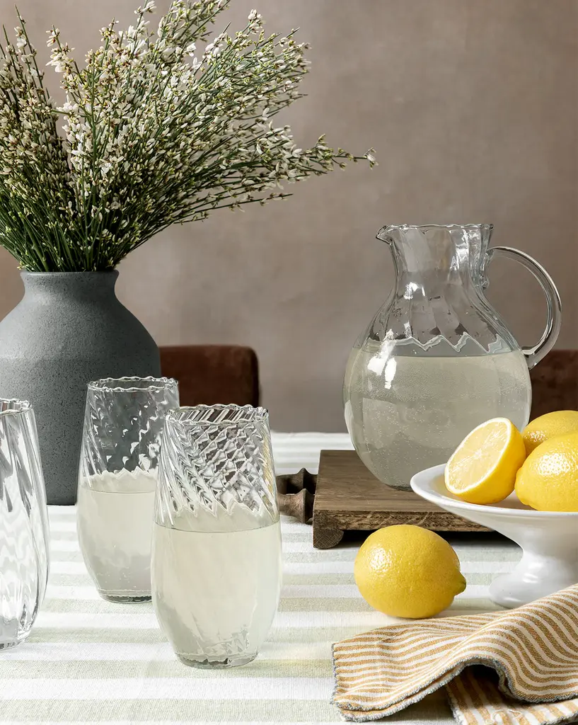 Delicately bold, the Adderley Highball Glasses are crafted with mouth blown glass. The casual silhouettes feature a scalloped rim, a twisted glass optic, and a smooth touch with ribbed detail that is purely visual. These unique glasses blend seamlessly with your table settings for both versatility and charm.