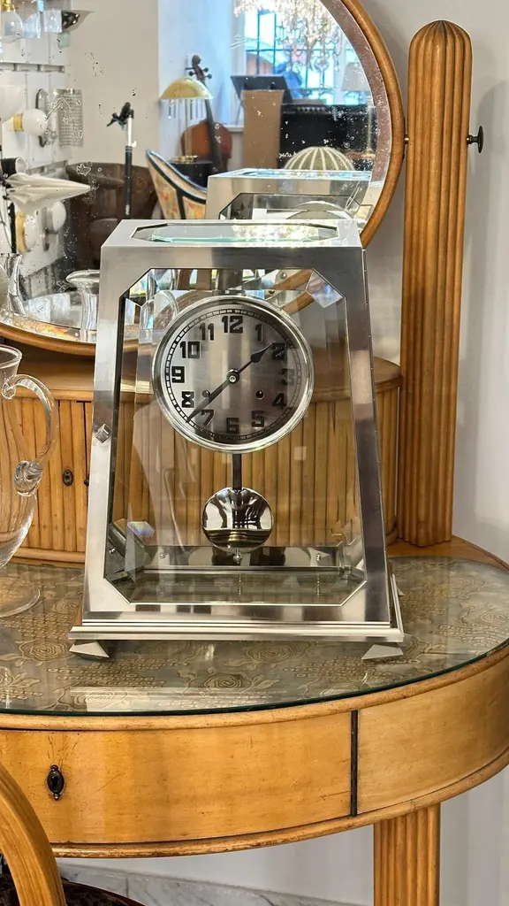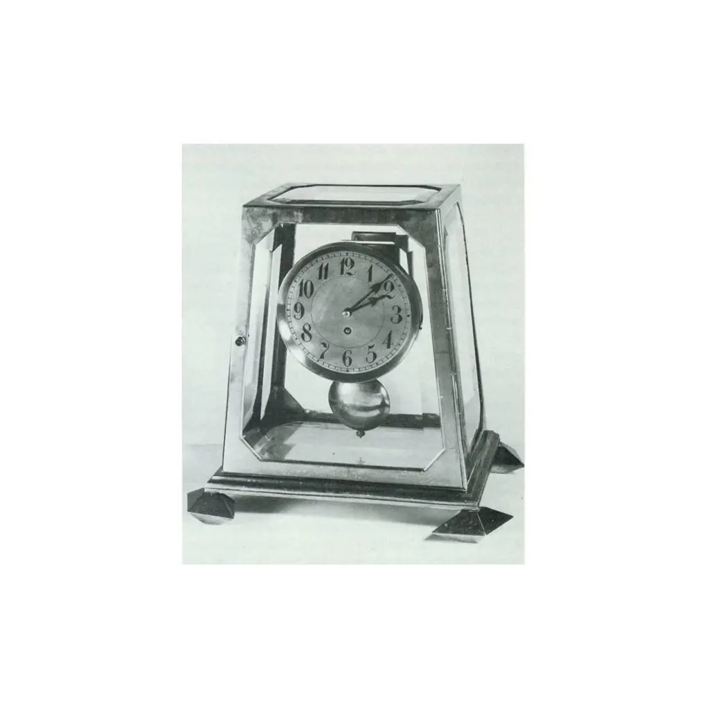 Mantelpiece clock, often used by Adolf Loos in houses he designed. Casted brass-frame on four Rhomboid legs, strengthened edges leading to octagonal side frames, facettet glasses, closable frontdoor, "free-floating" clockwork mounted on the back-side, painted clock-face, brass clockwork with springdrive. Vgl. Rukschcio/Schachel, Adolf Loos, Wien 1982, S 45. Designed 1900, now manufactured at the WOKA Workshop in Vienna.