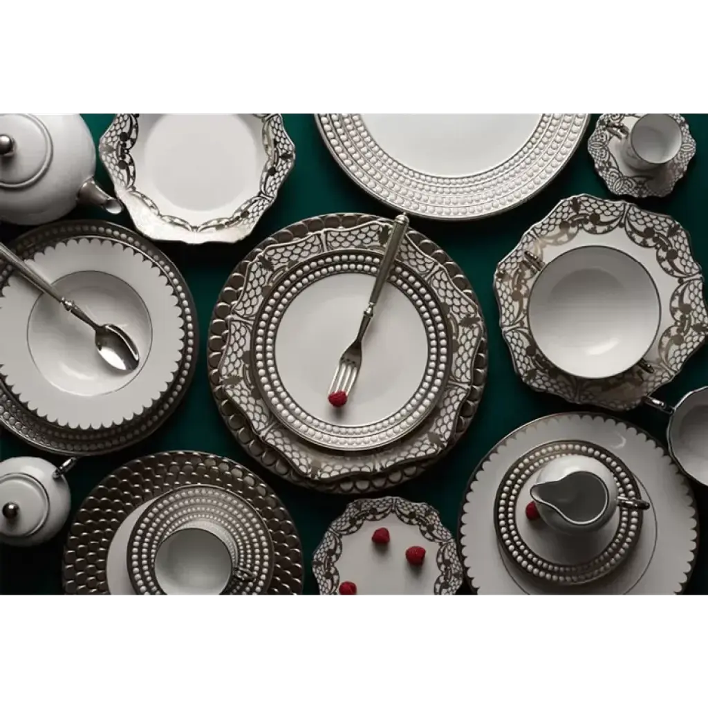 Inspired by the art of the ancient Greeks, L'Objet's Aegean Sculpted Platinum dinnerware is edged with three layers of platinum scales. Each plate is made by hand from Fine porcelain. Mix and match with the Aegean Sculpted Colors dinnerware collections for an elegant look. Five piece place setting includes dinner plate, dessert plate, bread & butter plate, teacup and saucer. Prior to founding L’Objet in 2004, Israeli-born Elad Yifrach was a successful designer in Beverly Hills. He was creating beautiful interiors, but he was frustrated by the limited options available in home accessories, so he set out to create something better. L’Objet’s collections are diverse, but they are almost always inspired by nature and architecture. Many of his exquisite serving pieces rest in a base of hand-crafted gold foliage, other pieces feature intricate design and beadwork, and some of the most striking objects actually look like miniature buildings. And despite the lux feel, much of the line is practical with just a touch of whimsy.
