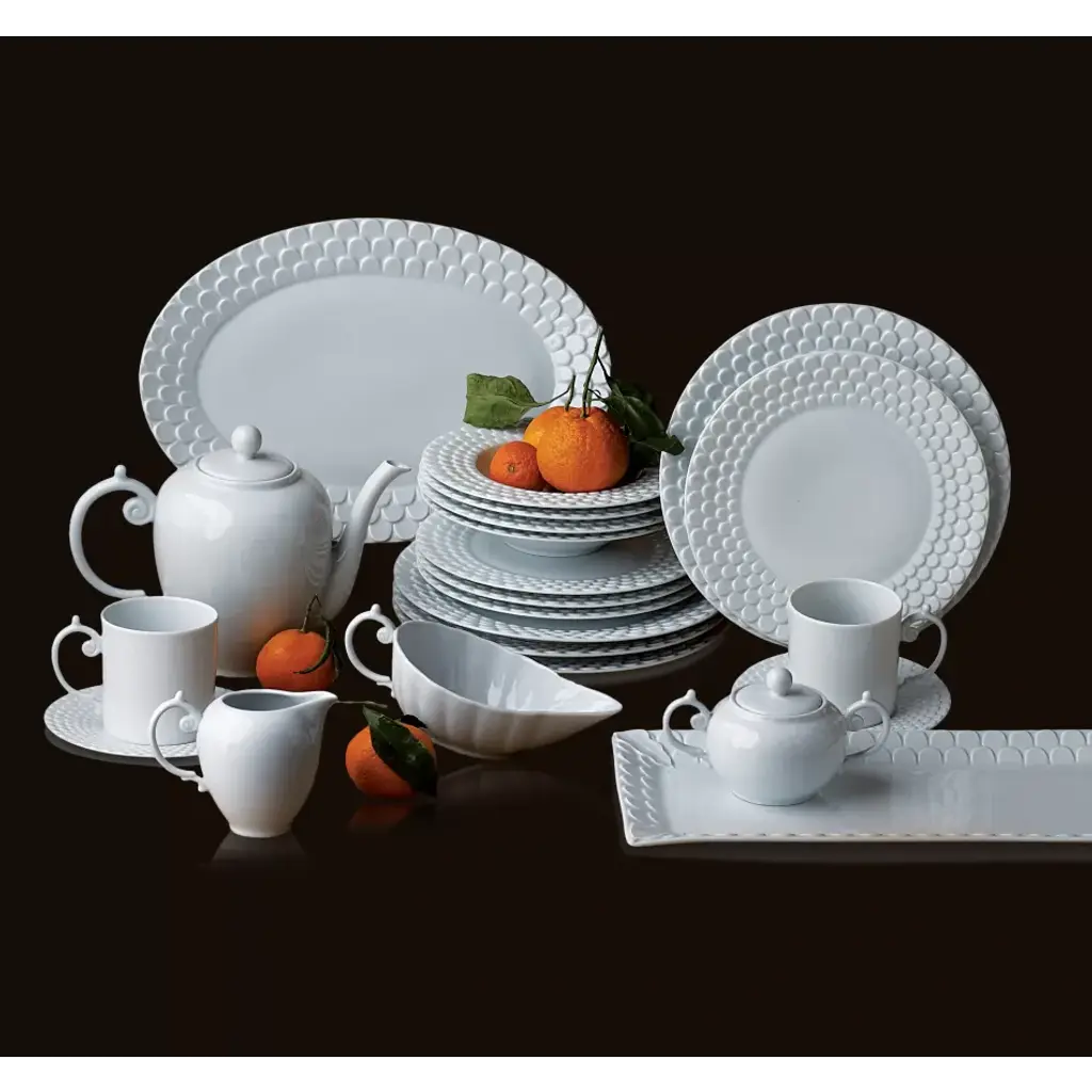 Inspired by the art of the ancient Greeks, L'Objet's Aegean Sculpted dinnerware is edged with three layers of beautiful scales. Each plate is made by hand from Fine porcelain. Five-piece settings include dinner plate, dessert plate, bread and butter plate, tea cup, and saucer. Prior to founding L’Objet in 2004, Israeli-born Elad Yifrach was a successful designer in Beverly Hills. He was creating beautiful interiors, but he was frustrated by the limited options available in home accessories, so he set out to create something better. L’Objet’s collections are diverse, but they are almost always inspired by nature and architecture. Many of his exquisite serving pieces rest in a base of hand-crafted gold foliage, other pieces feature intricate design and beadwork, and some of the most striking objects actually look like miniature buildings. And despite the lux feel, much of the line is practical with just a touch of whimsy.