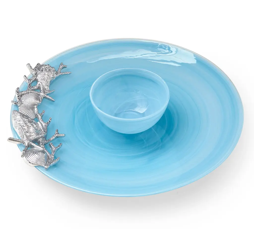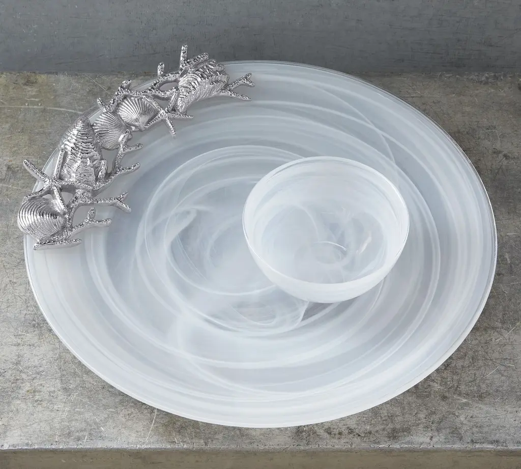Like art for your table, each piece of the Alabaster Dinnerware Collection features marbleized swirls and unique striations that result in stunning water-like movement. In your choice of two mesmerizing colors, this serving platter serves as a beautiful backdrop for family-style meals. For a touch of seaside style, its detailed with a handcrafted aluminum handle.