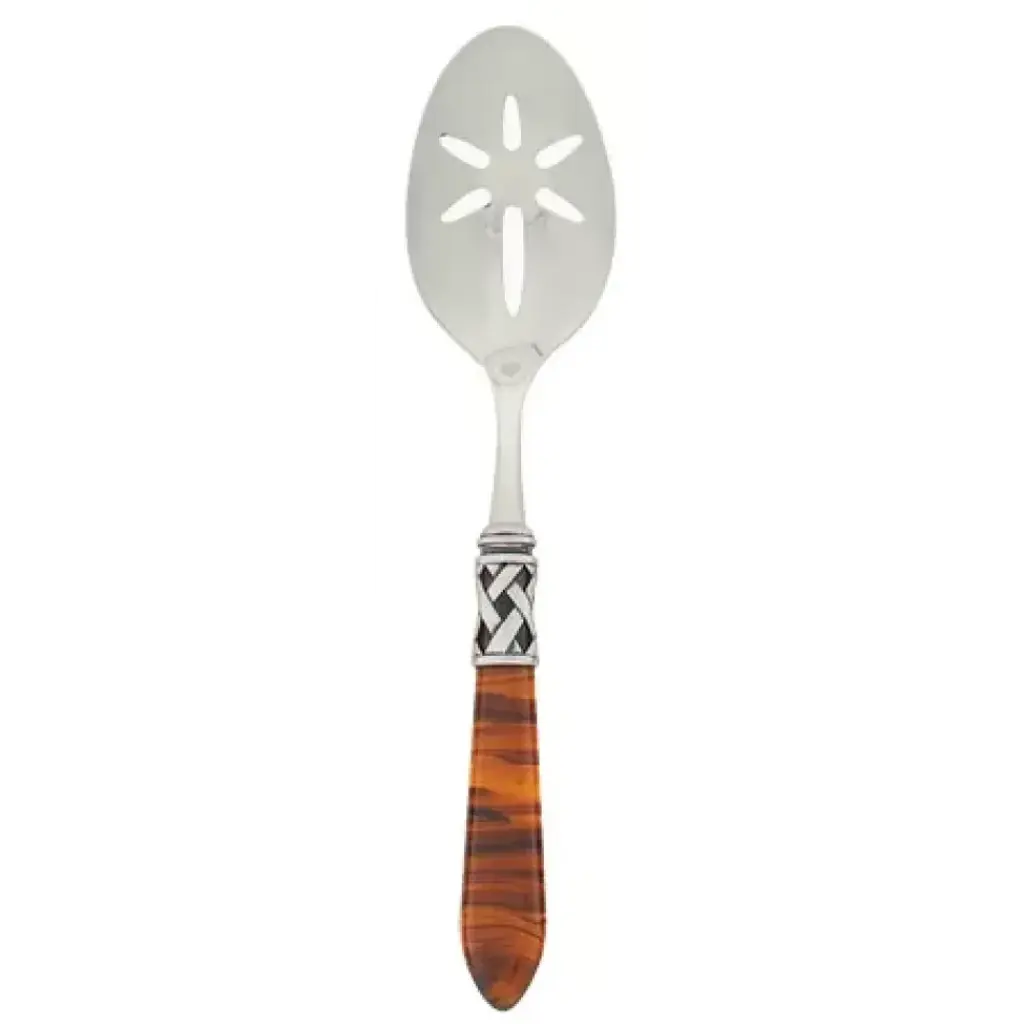 The Aladdin Antique Slotted Serving Spoon features elegant pearlized handles with the strength of high-grade acrylic and 18/10 stainless steel. This piece is also available in our brilliant finish. Since 1983, Vietri has specialized exclusively in Italian handcrafted ceramics, stainless and pewter flatware, mouth blown glassware, lamps, urns and planters. Families of artisans with 3 or 4 generations of history create these special pieces using centuries-old techniques. The subtle color from a paintbrush and the curving stroke of the artist's hand are never repeated in quite the same way, making each piece truly unique.