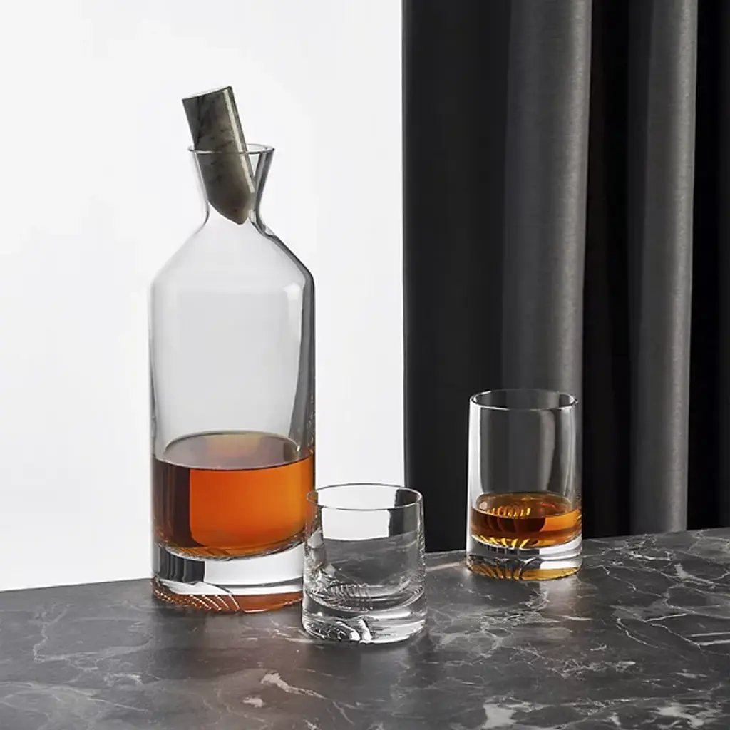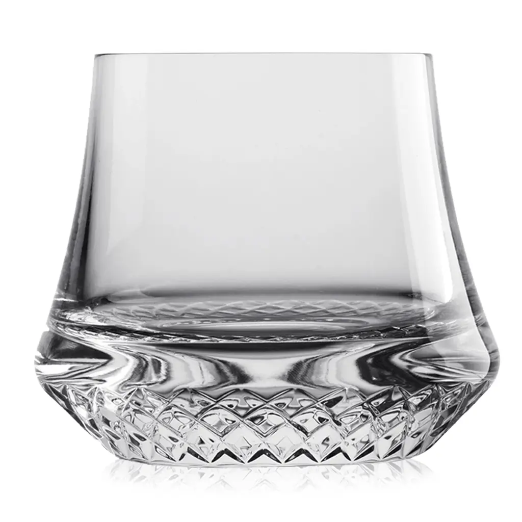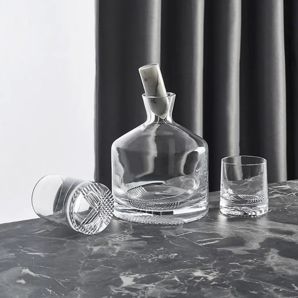 The Alba Whisky SOF Glasses, Set of 2 from Nude honors Scottish whisky tradition through its deconstructed tartan pattern, hand-engraved into the heavy crystal base, which creates textural depth beneath the smooth drinking surface. Designed by Joe Doucet and crafted in Turkey from lead-free crystal, each glass features a tapered shape that feels substantial in hand. The engraved pattern catches the light and adds tactile interest to the bottom portion, while the clear upper bowl maintains perfect clarity for appreciating the whisky's color.