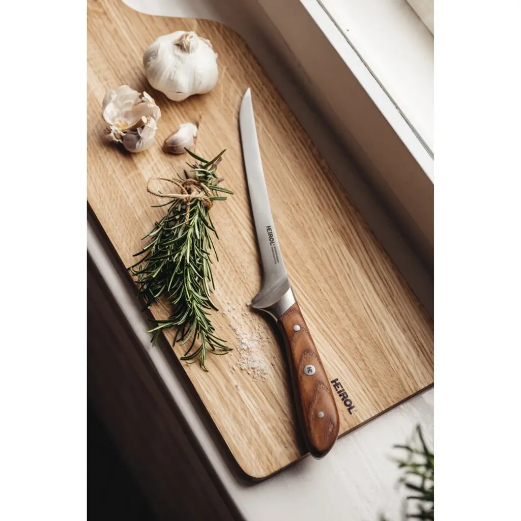 The Heirol Albera fileting knife is a beautifully designed kitchen knife with a lovely, traditional wooden handle. The knife is ideal for fileting fish. The knife's wooden handle is made of ash wood, while the blade is made of high-quality, corrosion-resistant steel. The forged blade is sturdy but at the same time adaptive, and its optimal sharpness and angle make all cutting tasks pleasant and effortless. The base of the blade is shaped so that the handle provides an ergonomic and secure grip.