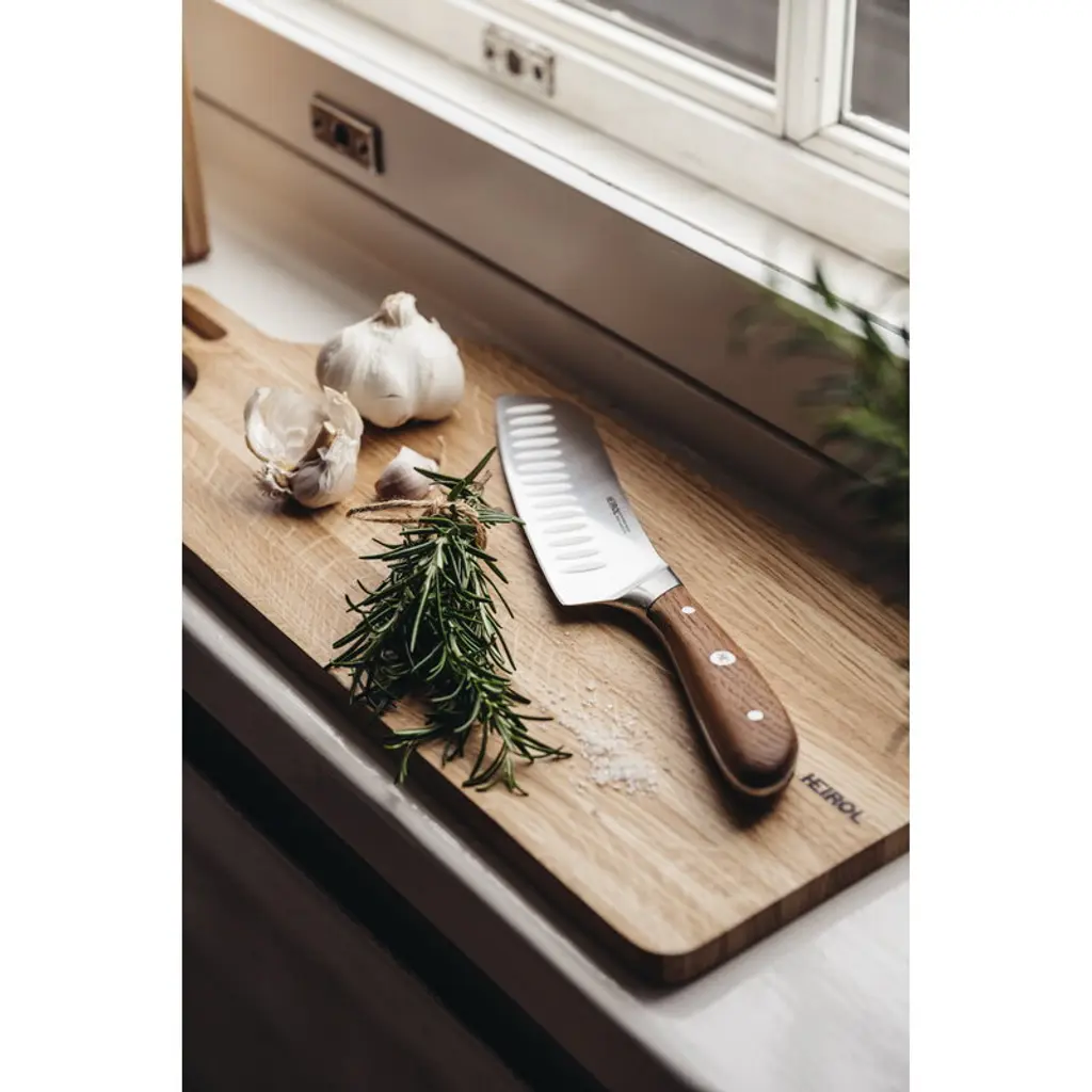 The Heirol Albera Santoku knife is a beautifully designed kitchen knife with a lovely, traditional wooden handle. The small knife makes a great all-purpose knife for chopping veggies, for example. The knife's wooden handle is made of ash wood, while the blade is made of high-quality, corrosion-resistant steel. The forged blade is sturdy but at the same time adaptive, and its optimal sharpness and angle make all cutting tasks pleasant and effortless. The base of the blade is shaped so that the handle provides an ergonomic and secure grip.
