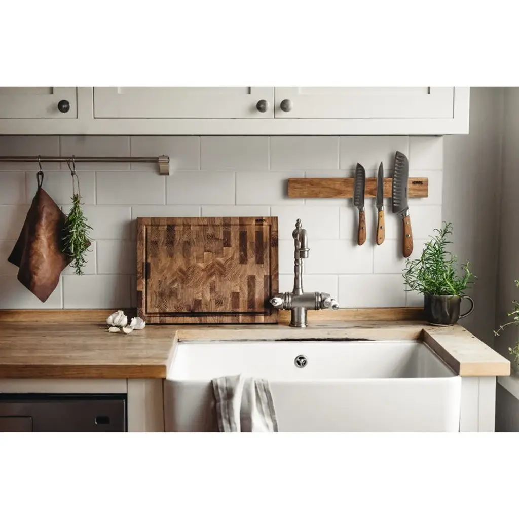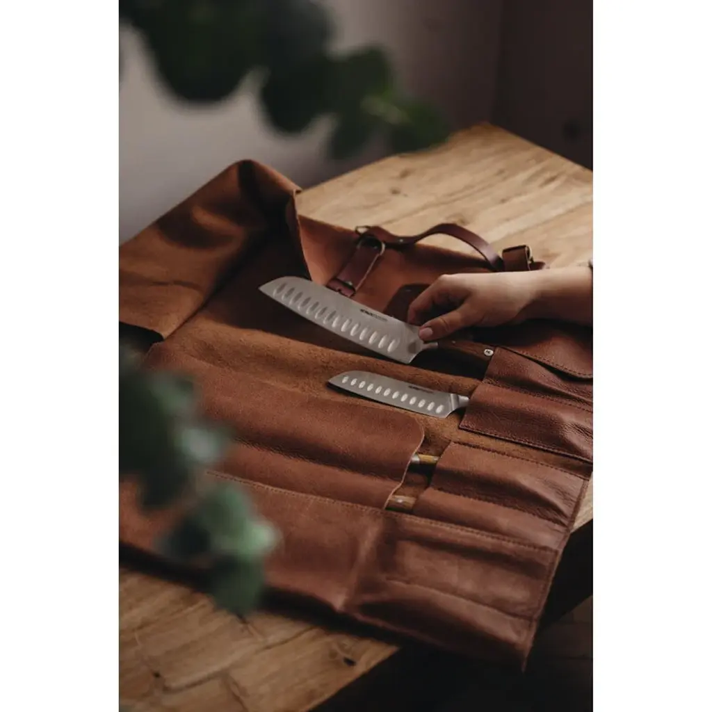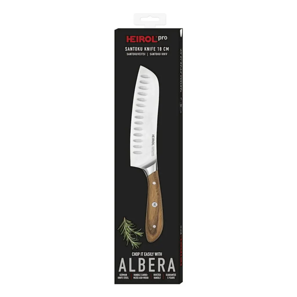 The Heirol Albera Santoku knife is a beautifully designed kitchen knife with a lovely, traditional wooden handle. The knife makes a great all-purpose knife for all cutting, slicing and chopping activities. The knife's wooden handle is made of ash wood, while the blade is made of high-quality, corrosion-resistant steel. The forged blade is sturdy but at the same time adaptive, and its optimal sharpness and angle make all cutting tasks pleasant and effortless. The base of the blade is shaped so that the handle provides an ergonomic and secure grip.